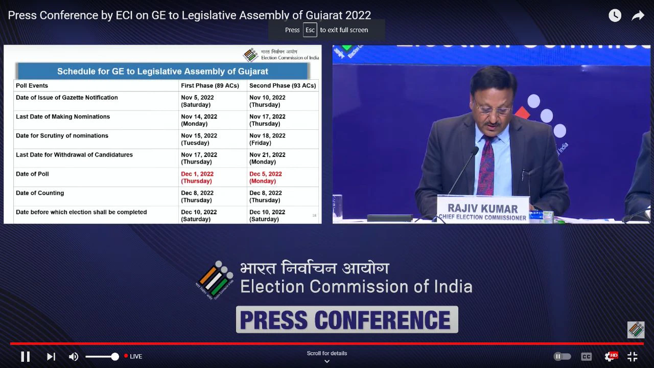 ഡൽഹിയിൽ ഉച്ചയ്ക്ക് 12 മണിയോടെ നടത്തിയ വാർത്താ സമ്മേളനത്തിൽ മുഖ്യ തെരഞ്ഞെടുപ്പ് കമ്മീഷണർ രാജീവ് കുമാറാണ് തീയതി പ്രഖ്യാപിച്ചത്.ആകെ 182 സീറ്റുകളിലേക്കാണ് തെരഞ്ഞെടുപ്പ്.
