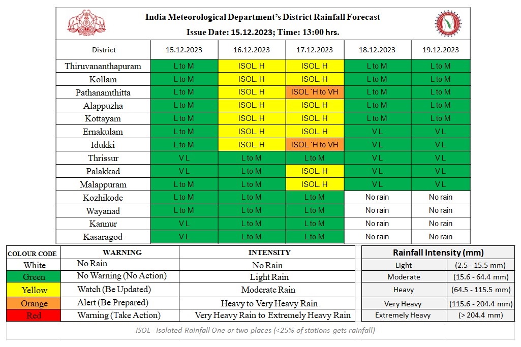 Read Moreകനത്ത മഴ സാധ്യത : 17-12-2023 :പത്തനംതിട്ട, ഇടുക്കി (ഓറഞ്ച് അലർട്ട് )