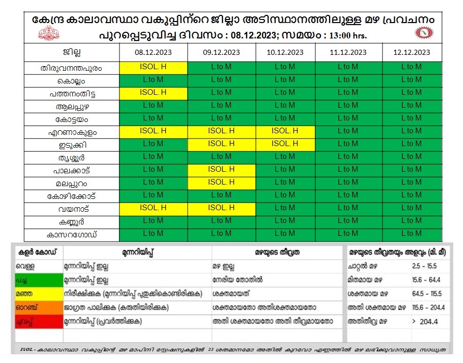 konnivartha.com: കേന്ദ്ര കാലാവസ്ഥാവകുപ്പിന്റെ അടുത്ത 5 ദിവസത്തേക്കുള്ള മഴ സാധ്യത പ്രവചനം. വിവിധ ജില്ലകളിൽ കേന്ദ്ര കാലാവസ്ഥ വകുപ്പ് മഞ്ഞ (Yellow) അലർട്ട് പ്രഖ്യാപിച്ചിരിക്കുന്നു. 08-12-2023 : തിരുവനന്തപുരം, പത്തനംതിട്ട, എറണാകുളം, വയനാട് 09-12-2023 : എറണാകുളം, ഇടുക്കി, പാലക്കാട്, മലപ്പുറം, വയനാട് 10-12-2023 : എറണാകുളം, ഇടുക്കി എന്നീ ജില്ലകളിലാണ് മഞ്ഞ അലർട്ട് പ്രഖ്യാപിച്ചിട്ടുള്ളത്. ഒറ്റപ്പെട്ട ശക്തമായ മഴയ്ക്കുള്ള സാധ്യതയാണ് പ്രവചിക്കപ്പെട്ടിരിക്കുന്നത്. 24 മണിക്കൂറിൽ 64.5 മില്ലിമീറ്റർ മുതൽ 115.5 മില്ലിമീറ്റർ വരെ മഴ ലഭിക്കുന്ന സാഹചര്യത്തെയാണ് ശക്തമായ മഴ എന്നത് കൊണ്ട് അർത്ഥമാക്കുന്നത്. തെക്ക് കിഴക്കൻ അറബിക്കടലിനും മാലിദ്വീപിനും മുകളിലായി ചക്രവാതചുഴി നിലനിൽക്കുന്നു. കേരളത്തിൽ അടുത്ത 5 ദിവസം ഇടി മിന്നലോടു കൂടിയ മിതമായ / ഇടത്തരം മഴ സാധ്യത. ഡിസംബർ 8 മുതൽ 10 വരെയുള്ള തീയതികളിൽ ഒറ്റപ്പെട്ട ശക്തമായ മഴക്കും…