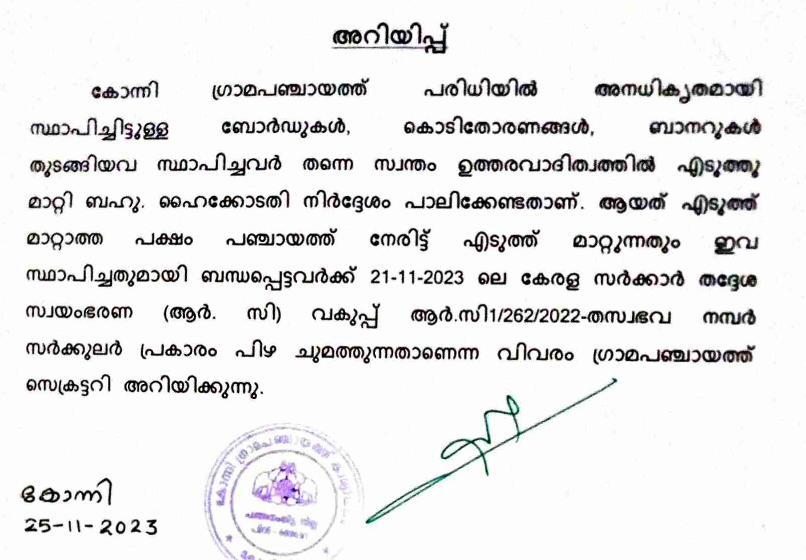 konnivartha.com: കോന്നി പഞ്ചായത്ത് പരിധിയില് അനധികൃതമായി സ്ഥാപിച്ച ബോര്ഡുകള് , കൊടിതോരണം , ബാനറുകള് എന്നിവ സ്ഥാപിച്ചവര് തന്നെ ഉടന് നീക്കം ചെയ്യണം എന്ന് പഞ്ചായത്ത് സെക്രട്ടറി അറിയിച്ചു . മാറ്റുന്നില്ല എങ്കില് പഞ്ചായത്ത് മാറ്റി പിഴ ഈടാക്കും എന്നും അറിയിച്ചു