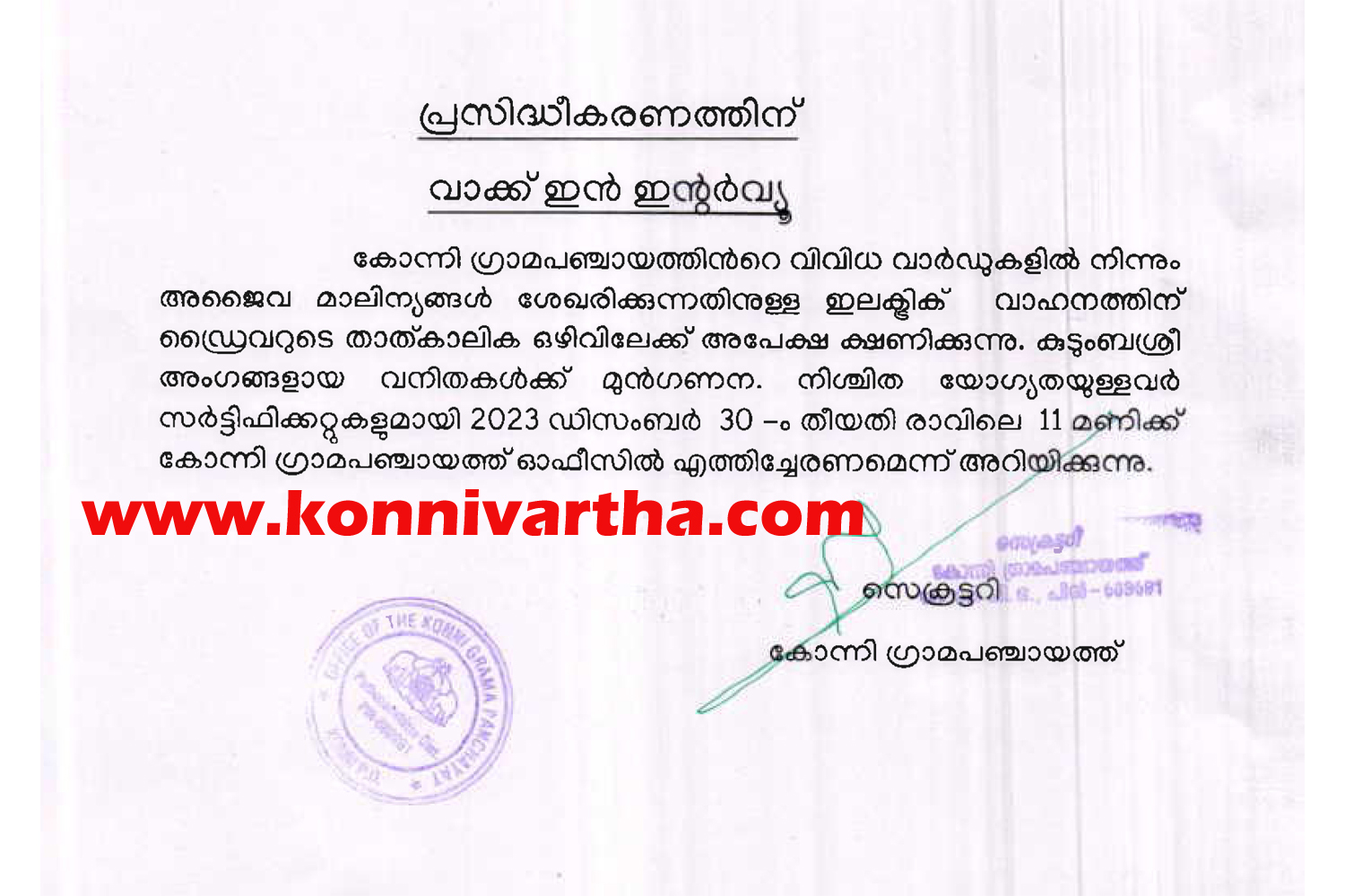 konnivartha.com: കോന്നി പഞ്ചായത്തിലെ വിവിധ വാര്ഡുകളില് നിന്നും അജൈവ മാലിന്യങ്ങള് ശേഖരിക്കുന്നതിന് ഇലക്ട്രിക് വാഹന ഡ്രൈവറുടെ താത്കാലിക ഒഴിവിലേക്ക് അപേക്ഷ ക്ഷണിച്ചു . കുടുംബ ശ്രീ അംഗങ്ങളായിട്ടുള്ള വനിതകള്ക്ക് മുന്ഗണന . യോഗ്യത ഉള്ളവര് സര്ട്ടിഫിക്കറ്റുകളുമായി 2023 ഡിസംബര് 30 ന് രാവിലെ 11 ന് കോന്നി പഞ്ചായത്ത് ഓഫീസില് എത്തണം എന്ന് സെക്രട്ടറി അറിയിച്ചു