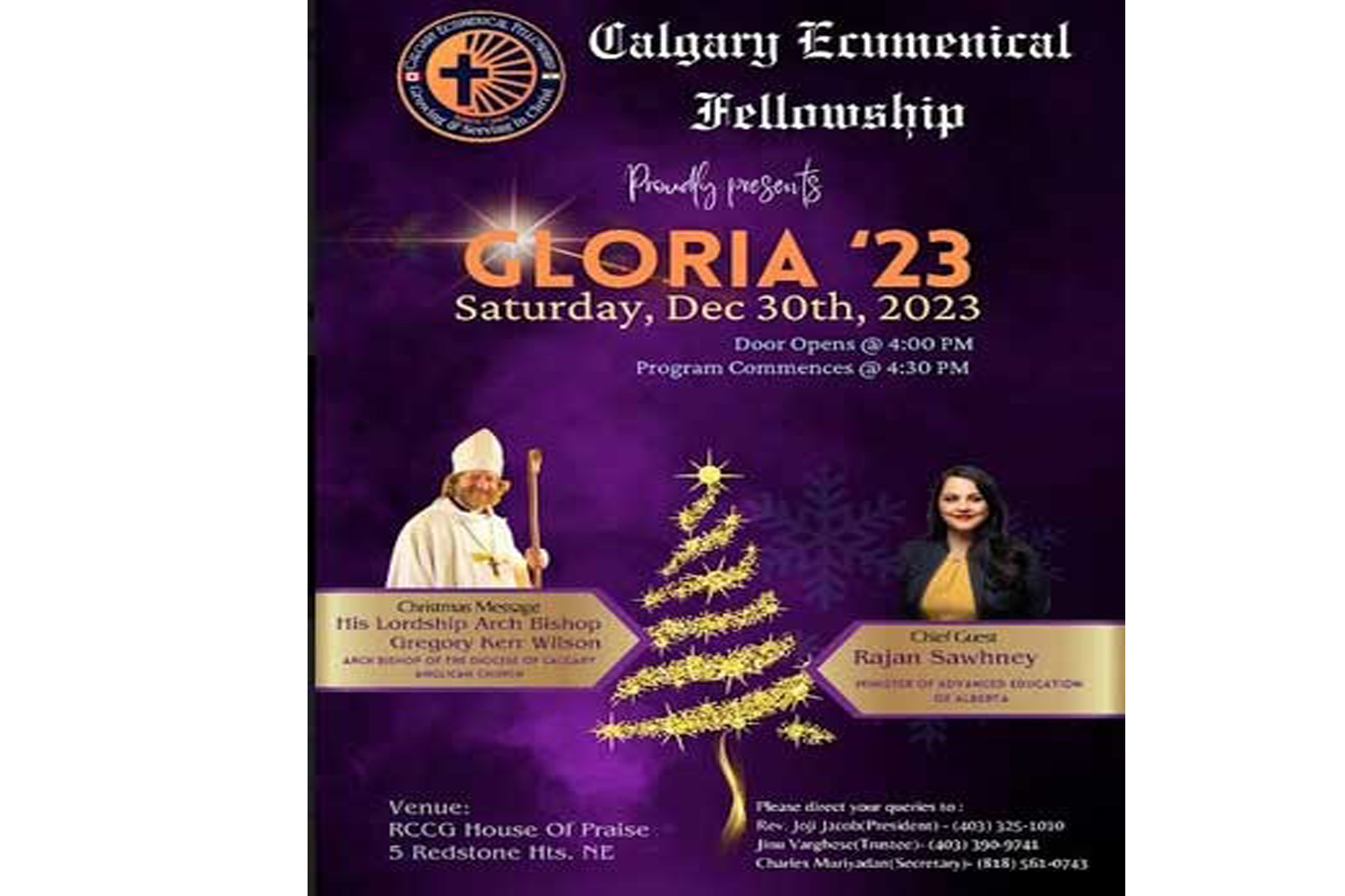 konnivartha.com/ കാൽഗറി: കാൽഗറിയിലെ അപ്പോസ്തോലിക സഭാ വിഭാഗങ്ങളുടെ കൂട്ടായ്മയായ കാൽഗറി എക്യൂമെനിക്കൽ ഫെല്ലോഷിപ്പിന്റ് ക്രിസ്മസ് ആഘോഷം “ഗ്ലോറിയ -23 ” ഡിസംബർ 30 ന് RCCG House Of Praise , 5 Redstone Hts ൽ വച്ച് നടത്തപ്പെടുന്നു. പ്രസ്തുത ക്രിസ്മസ് കരോളിൽ ബഹുമാനപ്പെട്ട രാജൻ സാനെ (ആൽബെർട്ട മിനിസ്റ്റർ ഓഫ് അഡ്വാൻസ്ഡ് എഡ്യൂക്കേഷൻ ) മുഖ്യാഥിതിയായിരിക്കും. അഭിവന്ദ്യ.ആർച്ച് ബിഷപ്പ് ഗ്രിഗറി കെർ വിൽസൺ ( കാൽഗറി ആംഗ്ലിക്കൻ ചർച്ച് ), ക്രിസ്തുമസ് സന്ദേശം നല്കുന്നതുമായിരിക്കും, കൂടാതെ കാൽഗറി എക്യൂമെനിക്കൽ ഫെല്ലോഷിപ്പിലെവിവിധ ഇടവക അംഗങ്ങളുടെ വൈവിദ്ധ്യമാർന്ന ക്രിസ്മസ് കലാ വിരുന്നും ഉണ്ടായിരിക്കും . കാൽഗറിയിലെ അപ്പോസ്തോലിക സഭാ വിഭാഗങ്ങളായ, സെന്റ് ജൂഡ് സിറോ മലങ്കര കത്തോലിക്ക മിഷൻ , സെയിന്റ് മേരീസ് മലങ്കര ഓർത്തഡോക്സ് ചർച്ച് ,സെന്റ് മദർ തെരേസ സിറോ മലബാർ ചർച്ച്…