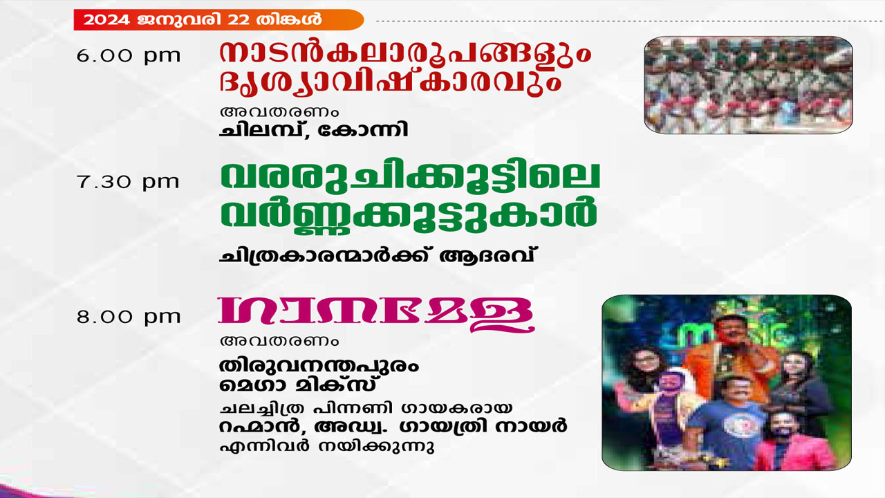 2024 ജനുവരി 23 ചൊവ്വ 5.30 മുതൽ കോന്നി എസ്.എൻ കലാക്ഷേത്ര മ്യൂസിക് & ഡാൻസ് അവതരിപ്പിക്കുന്ന സംഗീത നടന ലയ ചാരുത 8 മുതൽ ചന്ദ്രൻ പരിയാരം സംവിധാനം ചെയ്ത് കോഴിക്കോട് പേരാമ്പ്ര വജ്രിക & കലൈഭാരതി അവതരിപ്പിക്കുന്ന ഡാൻസ് ഫ്യൂഷൻ