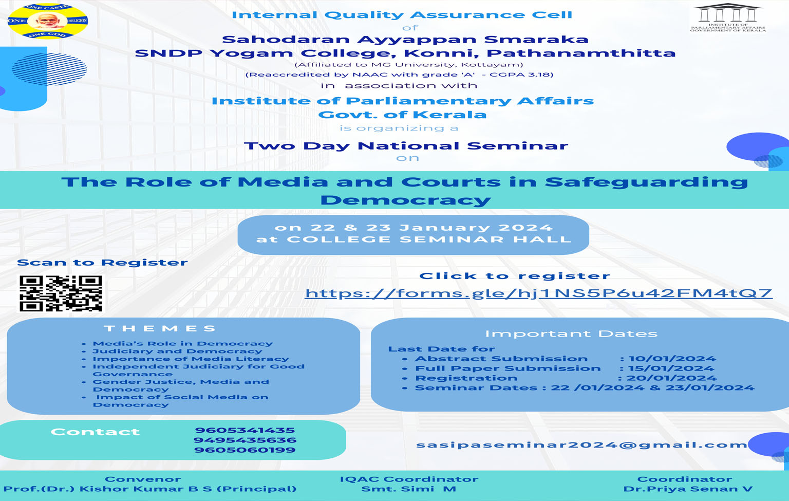 konnivartha.com: കോന്നി എസ്. എ. എസ്. എസ്. എൻ. ഡി. പി യോഗം കോളേജിന്റെ നേതൃത്വത്തിൽ ഇൻസ്റ്റിറ്റ്യൂട്ട് ഓഫ് പാർലിമെന്ററി അഫയേർഴ്സുമായി സഹകരിച്ചു തിങ്കൾ, ചൊവ്വ ദിവസങ്ങളിൽ കോളേജിൽ ദേശീയ സെമിനാർ നടത്തും. ജനാധിപത്യ സംരക്ഷണത്തിൽ മാധ്യമങ്ങളുടെയും കോടതിയുടെയും പങ്ക് എന്നതാണ് വിഷയം. തിങ്കൾ രാവിലെ 10ന് കെ. യു. ജനീഷ് കുമാർ എം. എൽ. എ ഉദ്ഘാടനം ചെയ്യും. എസ്. എൻ ട്രസ്റ്റ് ട്രഷറർ ഡോ. ജി. ജയദേവൻ അധ്യക്ഷനായിരിക്കും. എം. ജി യൂണിവേഴ്സിറ്റി രജിസ്ട്രാർ ഡോ. കെ. ജയചന്ദ്രൻ, സ്കൂൾ ഓഫ് ഗാന്ധിയൻ തൊട്സ് ആൻഡ് ഡെവലപ്പ്മെന്റ് സ്റ്റഡീസ് ഡയറക്ടർ ഡോ ഡോ. ബിജു ലക്ഷ്മണൻ എന്നിവർ മുഖ്യ പ്രസംഗങ്ങൾ നടത്തും. മുതിർന്ന മാധ്യമ പ്രവർത്തകൻ സാം ചെമ്പകത്തിൽ, അഡ്വ. സീനാ. എസ്. നായർ, സബ് ജഡ്ജ് സി. ആർ. രാജശ്രീ, മാധ്യമ…