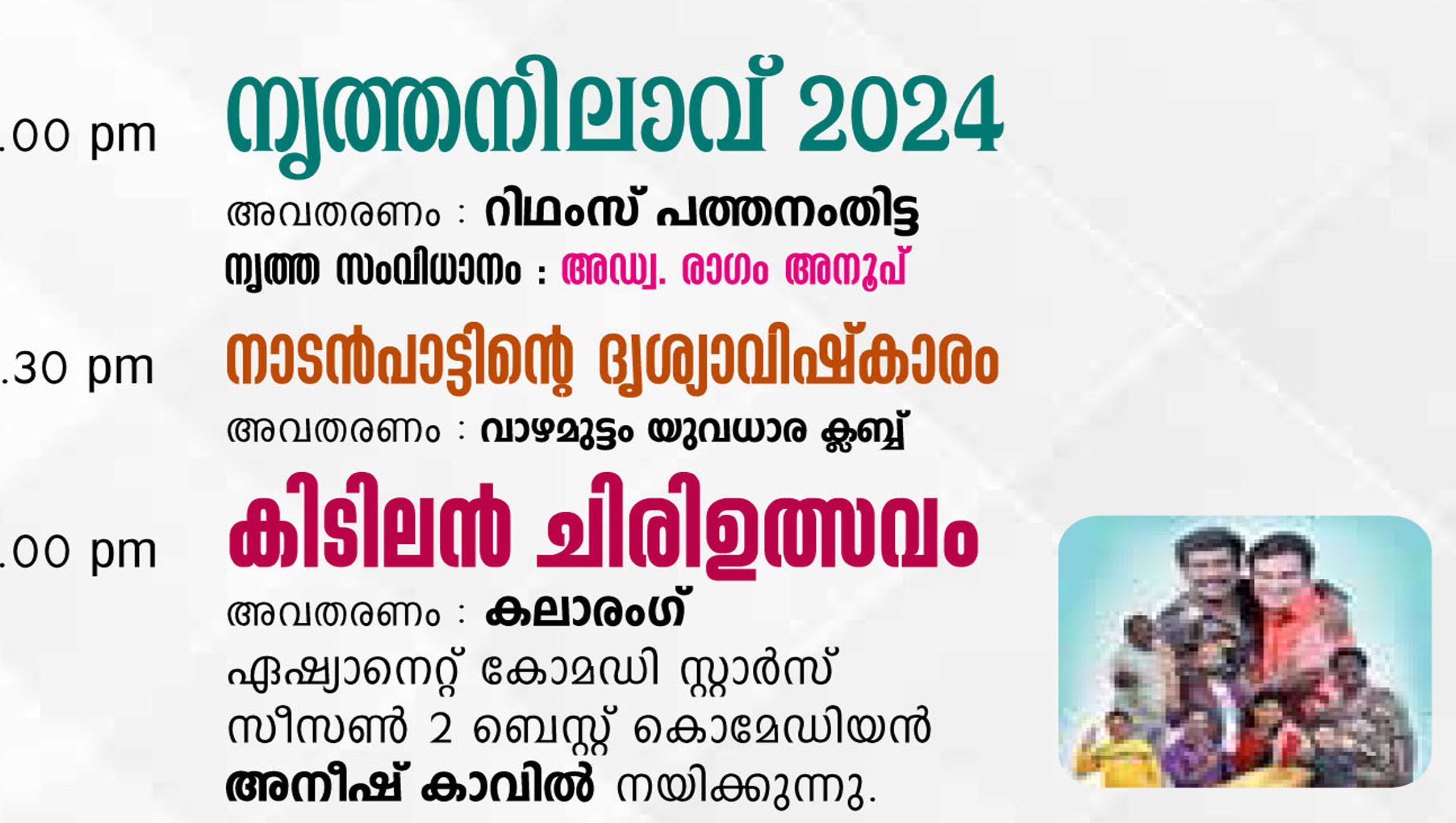 2024 ജനുവരി 20 ശനി വൈകിട്ട് 4 മണിക്ക് ചലച്ചിത്ര ഗാനാലാപന മത്സരം വൈകിട്ട് 6 മണി മുതൽ നൃത്തനിലാവ് 2024 അവതരണം : അഡ്വ രാഗം അനൂപ്, റിഥംസ്, പത്തനംതിട്ട വൈകിട്ട് 7.30 നാടൻ പാട്ടിന്റെ ദൃശ്യാവിഷ്കാരം അവതരണം : വാഴമുട്ടം യുവധാര ക്ലബ്ബ് 8 മണി മുതൽ ഏഷ്യാനെറ്റ് കോമഡി സ്റ്റാർസ് സീസൺ 2 ബെസ്റ്റ് കൊമേഡിയൻ അനീഷ് കാവിൽ നയിക്കുന്ന കലാരംഗ് അവതരിപ്പിക്കുന്ന കിടിലൻ ചിരിഉത്സവം