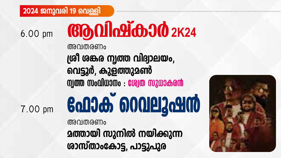 2024 ജനുവരി 19 വെള്ളി: വൈകിട്ട് 6 മണി ശ്രീ ശങ്കര നൃത്ത വിദ്യാലയം വെട്ടൂർ – കുളത്തുമൺ അവതരിപ്പിക്കുന്ന ആവിഷ്കാർ 2K24 വൈകിട്ട് 7 മണി മുതൽ മത്തായി സുനിൽ നയിക്കുന്ന ഫോക് റെവലൂഷൻ അവതരണം : ശാസ്താംകോട്ട, പാട്ടുപുര