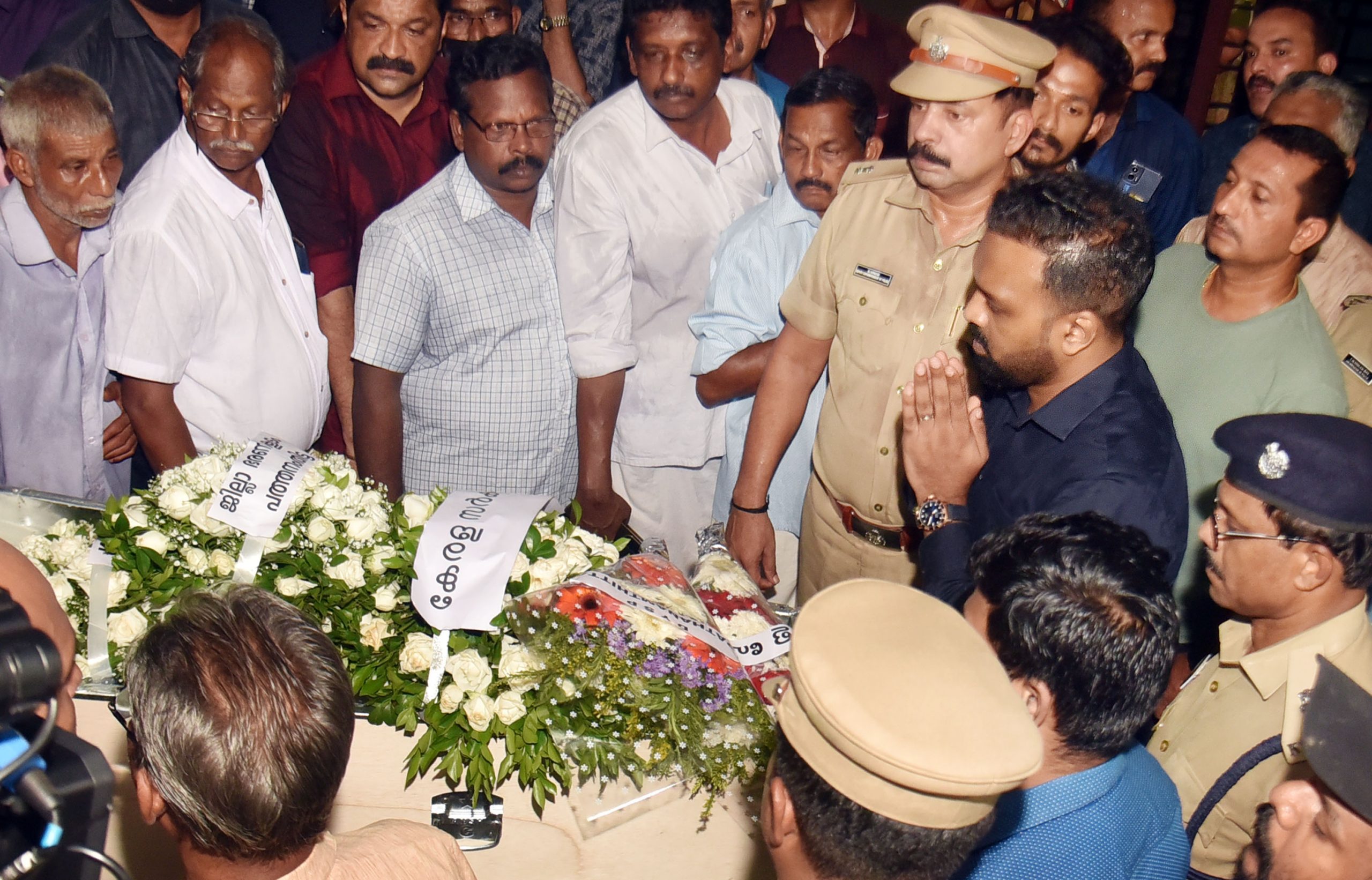 കുവൈറ്റ് തീപിടുത്തത്തിൽ മരിച്ച പത്തനംതിട്ട വാഴമുട്ടം സ്വദേശി പി.വി. മുരളീധരൻ നായരുടെ സംസ്കാര ചടങ്ങിൽ ജില്ലാ ഭരണകൂടത്തിനു വേണ്ടി ജില്ലാ കളക്ടർ എസ്. പ്രേം കൃഷ്ണൻ മൃതദേഹത്തിൽ റീത്ത് സമർപ്പിക്കുന്നു