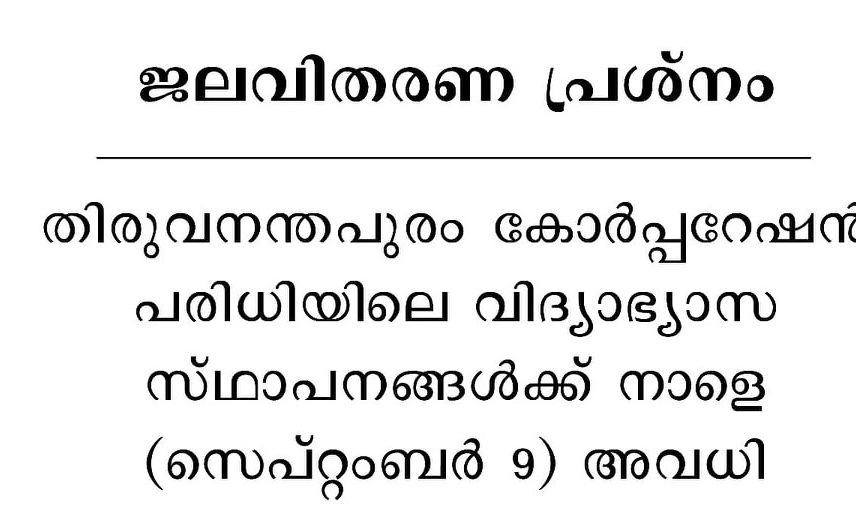 The District Collector has declared a holiday for all the educational institutions- schools as well as colleges (including professional colleges) under Thiruvananthapuram Corporation limits tomorrow (September 9) due to the ongoing issue of water supply in the city.