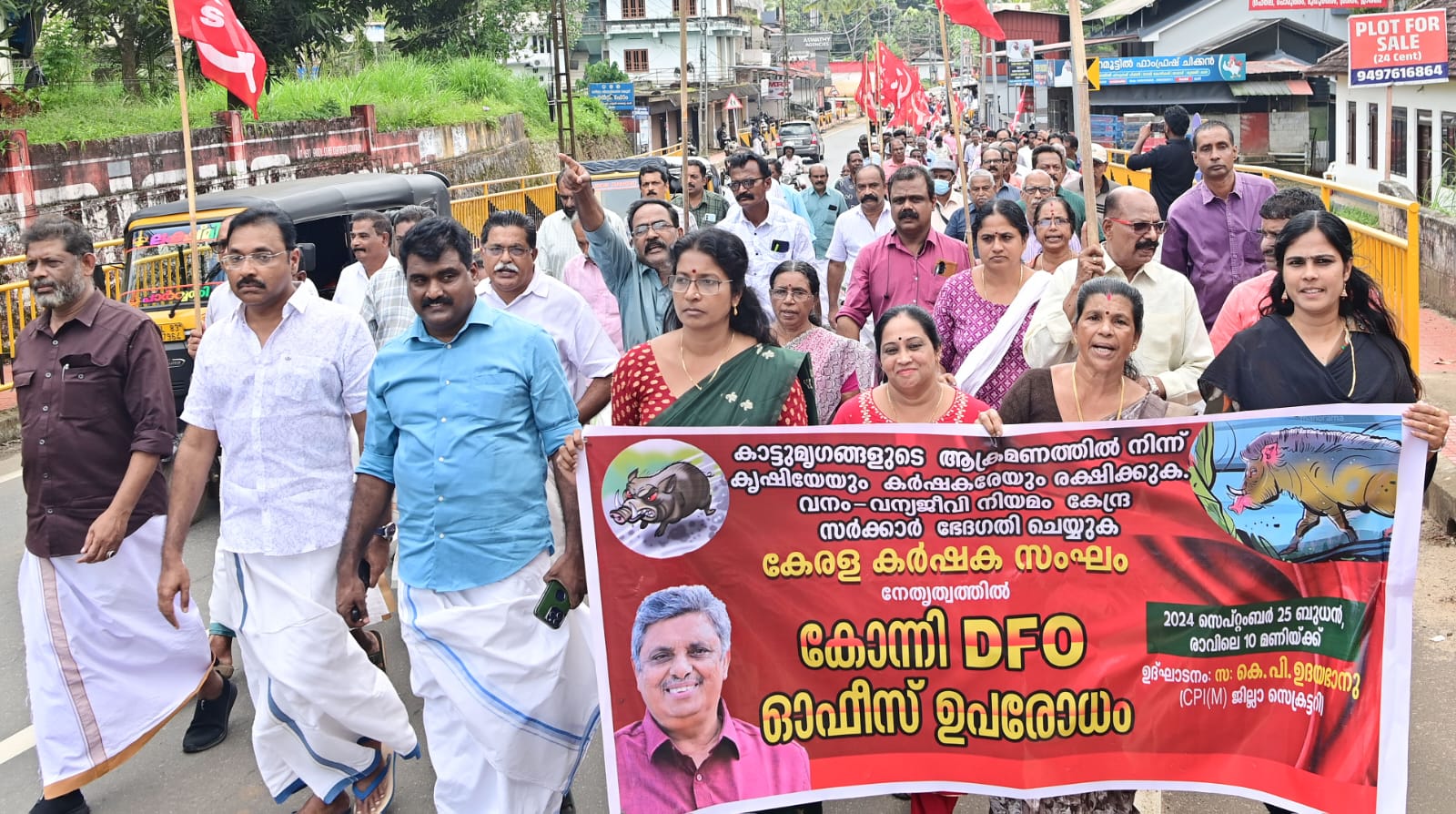 വന്യജീവി നിയമം കേന്ദ്രസർക്കാർ പരിഷ്കരിക്കുക തുടങ്ങിയ ആവശ്യങ്ങൾ ഉന്നയിച്ച് കേരള കർഷകസംഘം നേതൃത്വത്തിൽ കോന്നി ഡിവിഷണൽ ഫോറസ്റ്റ് ഓഫീസിലേക്ക് കർഷകർ നടത്തിയ പ്രതിഷേധ മാർച്ചിലാണ് പ്രതിഷേധം ഇരമ്പിയത്.മലയോര മേഖലയിലെ വിവിധ പ്രദേശങ്ങളിൽ നിന്നും നിരവധി കർഷകരാണ് സമരത്തിൽ അണിനിരന്നത്.
