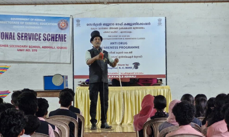 konnivartha.com: കേന്ദ്ര വാർത്താ വിതരണ പ്രക്ഷേപണ മന്ത്രാലയത്തിന് കീഴിലുള്ള സെൻട്രൽ ബ്യൂറോ ഓഫ് കമ്മ്യൂണിക്കേഷൻ എറണാകുളം യൂണിറ്റിന്റെ ആഭിമുഖ്യത്തിൽ അടിമാലി വൊക്കേഷണൽ ഹയർസെക്കൻഡറി സ്കൂളിൽ ലഹരി വിരുദ്ധ ബോധവൽക്കരണ സന്ദേശവുമായി മാജിക് ഷോ സംഘടിപ്പിച്ചു. മജീഷ്യൻ ആർ. സി ബോസ് നേതൃത്വം നൽകി.