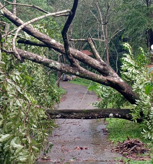 ഇന്നലെ വൈകിട്ട് അഞ്ചുമണിയോടുകൂടിയുള്ള മഴയിലും കാറ്റിലും ആണ് മരം നിലം പതിച്ചത്. ഇത് വരെ മരം മുറിച്ചു നീക്കിയിട്ടില്ലയിട്ടില്ല. സമീപം തന്നെ മറ്റൊരു മരവും അപകട സ്ഥിതിയിൽ ആണ്