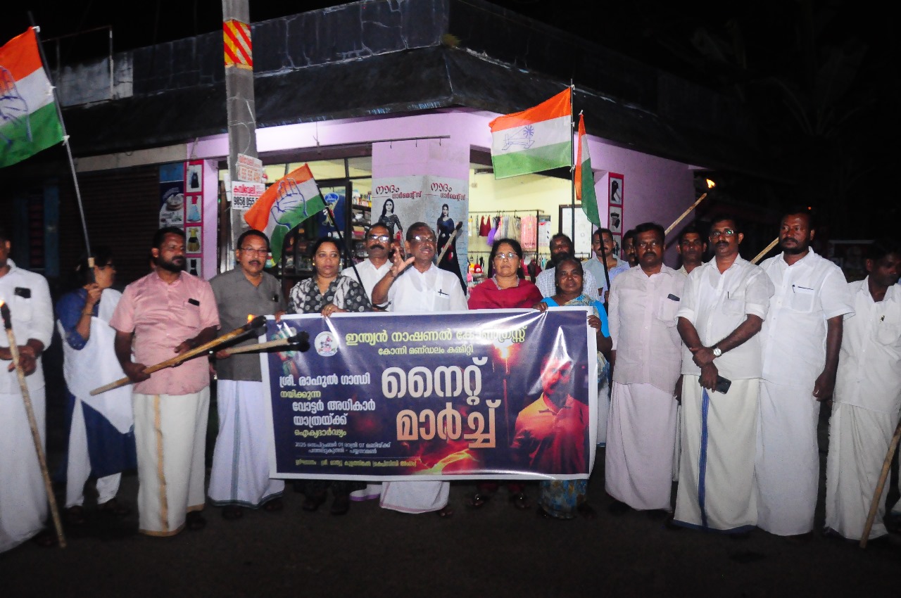 konnivartha.com: : വോട്ടർ അധികാർ യാത്ര നടത്തിയ രാജ്യത്തിൻ്റെ പ്രതിപക്ഷ നേതാവ് രാഹുൽ ഗാന്ധിയ്ക്ക് ഐക്യദാർഢ്യം പ്രഖ്യാപിച്ച് കോന്നി കോൺഗ്രസ്സ് മണ്ഡലം കമ്മിറ്റിയുടെ നേതൃത്വത്തിൽ പത്തലുകുത്തിയിൽ നിന്ന് പയ്യനാമൺ ജംഗ്ഷനിലേക്ക് നൈറ്റ് മാർച്ച് നടത്തി. മണ്ഡലം പ്രസിഡൻ്റ് പ്രവീൺ പ്ലാവിളയിൽ അദ്ധ്യക്ഷത വഹിച്ചു. കെ പി സി സി അംഗം മാത്യു കുളത്തിങ്കൽ ഉദ്ഘാടനം ചെയ്തു. ദീനാമ്മ റോയി, എസ്. സന്തോഷ് കുമാർ, എബ്രഹാം വാഴയിൽ, ശ്യാം. എസ്. കോന്നി, അഡ്വ എസ്. റ്റി ഷാജികുമാർ, ഐവാൻ വകയാർ, ഷിജു അറപ്പുരയിൽ, സി.കെ ലാലു, പി.വി ജോസഫ്, മോഹനൻ കാലായിൽ, സുലേഖ വി. നായർ, ലിസിയാമ്മ ജോഷ്വാ, അജി മണ്ണിൽ, സാബു മഞ്ഞക്കടമ്പ്, അനി കുന്നത്ത്, വേണു പയ്യനാമൺ, ആൻ്റണി മണ്ണീറ, റോബിൽ ചെങ്ങറ എന്നിവർ പ്രസംഗിച്ചു.
