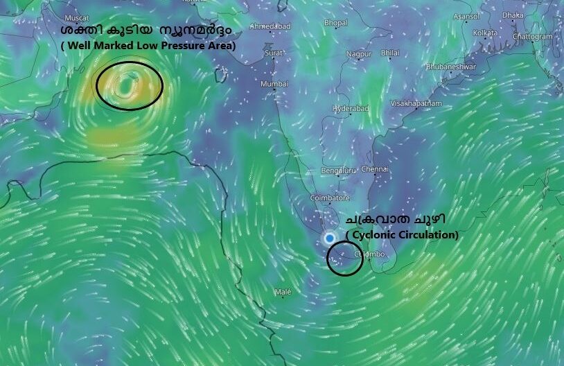 മധ്യ പടിഞ്ഞാറൻ അറബിക്കടലിനു മുകളിൽ ശക്തി കൂടിയ ന്യൂനമർദ്ദംസ്ഥിതിചെയ്യുന്നു. ഇത് കിഴക്കൻ-തെക്കു കിഴക്കൻ ദിശയിൽ അറബിക്കടലിന്റെ മദ്ധ്യഭാഗത്തേക്ക് നീങ്ങി അടുത്ത 12 മണിക്കൂറിനുള്ളിൽ ന്യൂനമർദ്ദമായി ശക്തി കുറയാൻ സാധ്യത.