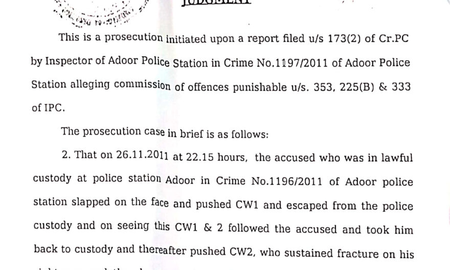 konnivartha.com; പത്തനംതിട്ട: ഔദ്യോഗിക സർക്കാർ ഡ്യൂട്ടിക്ക് തടസ്സം ഉണ്ടാക്കണമെന്നും നിയമപരമായ പോലീസ് കസ്റ്റഡിയിൽ നിന്നും രക്ഷപെട്ടു പോകണമെന്നുമുള്ള ഉദ്യേശത്തോടും കരുതലോടും കൂടി ഔദ്യോഗിക ഡ്യൂട്ടിയിൽ അടൂർ പോലീസ് സ്റ്റേഷൻ്റെ മുൻവശം ഗ്രില്ലിന് സമീപത്തായിനിന്ന പോലീസ് ഉദ്യോഗസ്ഥൻ്റെ ഇടതു ചെള്ളയ്ക്ക് കൈ കൊണ്ട് അടിക്കുകയുംപിടിച്ചു തള്ളുകയും ചെയ്ത ശേഷം പോലീസ് കസ്റ്റഡിയിൽ നിന്നും രക്ഷപെട്ട് പോകുന്നതുകണ്ട് അടൂർ പോലീസ് സബ് ഇൻസ്പെക്ടർ പി.ശ്രീകുമാർബലപ്രയോഗത്തിലൂടെ പ്രതിയെ അറസ്റ്റ് ചെയ്ത സമയം സബ് ഇൻസ്പെക്ടറുടെ വലതു കൈയ്ക്ക് പൊട്ടൽ സംഭവിച്ചു എന്നും ആരോപിച്ച് ഇന്ത്യൻ ശിക്ഷാ നിയമം 353, 225 ( B ),333 എന്നീ വകുപ്പുകൾ പ്രകാരം