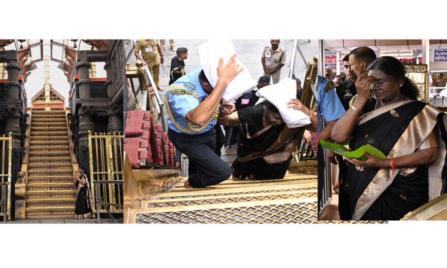 konnivartha.com; Hon’ble President of India, Droupadi Murmu, at Sabarimala Ayyappa Temple. President Droupadi Murmu, the second serving President of India and the first woman head of state, made history by offering prayers at the Sabarimala Temple in Kerala on October 22, 2025. At Pampa Ganapathi Temple, she participated in the sacred Irumudi Kettu ceremony, where the traditional pilgrim’s bundle was tied. Dressed in black attire and barefoot, Droupadi Murmu ascended the 18 sacred steps (Pathinettampadi) at Sannidhanam to offer prayers to Lord Ayyappa.