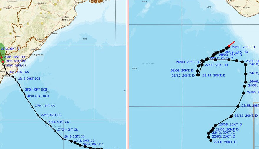 തുടർന്ന് തീരദേശ ആന്ധ്രയ്ക്ക് മുകളിൽ ചുഴലിക്കാറ്റായും നിലവിൽ അതിതീവ്ര ന്യൂനമർദമായും ( Deep Depression ) ശക്തി കുറഞ്ഞു. വടക്ക് -വടക്കുപടിഞ്ഞാറ് ദിശയിൽ നീങ്ങി ആന്ധ്രപ്രദേശ്, അതിനോട് ചേർന്ന തെലങ്കാന, തെക്കൻ ഛത്തീസ്ഗഢ് വഴി നീങ്ങി അടുത്ത 6 മണിക്കൂറിനുള്ളിൽ തീവ്ര ന്യൂനമർദമായി (Depression) വീണ്ടും ശക്തി കുറയാൻ സാധ്യത.