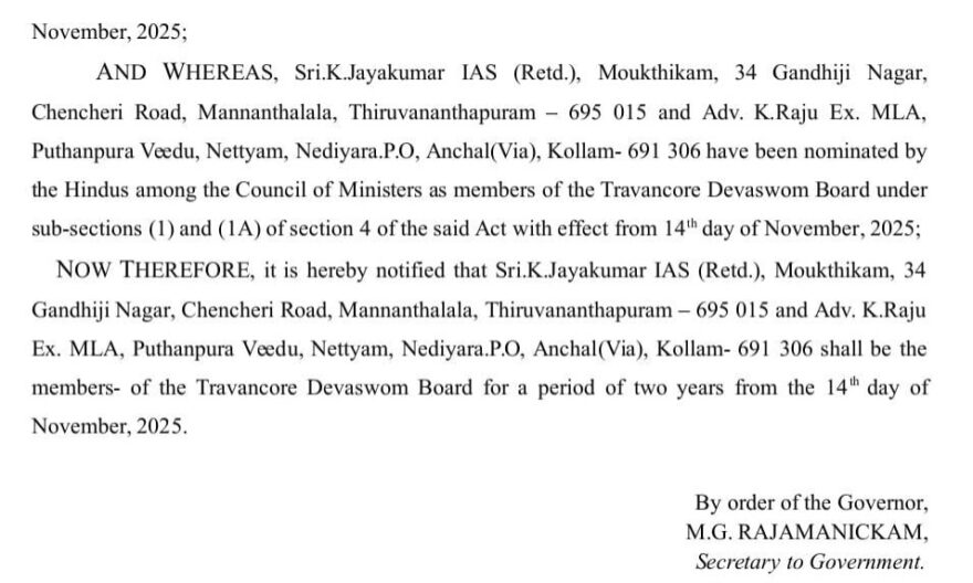 konnivartha.com; തിരുവിതാംകൂര് ദേവസ്വം ബോര്ഡ് പ്രസിഡന്റായി മുന് ചീഫ് സെക്രട്ടറിയും മുന് ഐഎഎസ് ഉദ്യോഗസ്ഥനുമായ കെ. ജയകുമാറിനെ നിയമിച്ച് സംസ്ഥാന സര്ക്കാര് ഉത്തരവിറക്കി. നവംബര് 14 വെള്ളിയാഴ്ച മുതല് ഉത്തരവ് പ്രാബല്യത്തില് വരും .