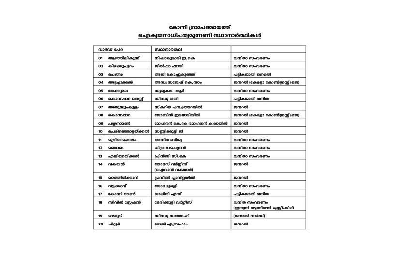 konnivartha.com; കോന്നി ഗ്രാമപഞ്ചായത്തിലെ 20 വാര്ഡുകളിലും മത്സരിക്കാന് ഉള്ള മുഴുവന് സ്ഥാനാർത്ഥികളെയും ഐക്യജനാധിപത്യമുന്നണി പ്രഖ്യാപിച്ചു