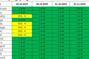 വിവിധ ജില്ലകളിൽ കേന്ദ്ര കാലാവസ്ഥ വകുപ്പ് മഞ്ഞ (Yellow) അലർട്ട് പ്രഖ്യാപിച്ചിരിക്കുന്നു. 29/10/2025 : പത്തനംതിട്ട, കോട്ടയം, ഇടുക്കി, എറണാകുളം, തൃശൂർ എന്നീ ജില്ലകളിലാണ് മഞ്ഞ അലർട്ട് പ്രഖ്യാപിച്ചിട്ടുള്ളത്. ഒറ്റപ്പെട്ട ശക്തമായ മഴയ്ക്കുള്ള സാധ്യതയാണ് പ്രവചിക്കപ്പെട്ടിരിക്കുന്നത്. 24 മണിക്കൂറിൽ 64.5 മില്ലിമീറ്റർ മുതൽ... Read more »