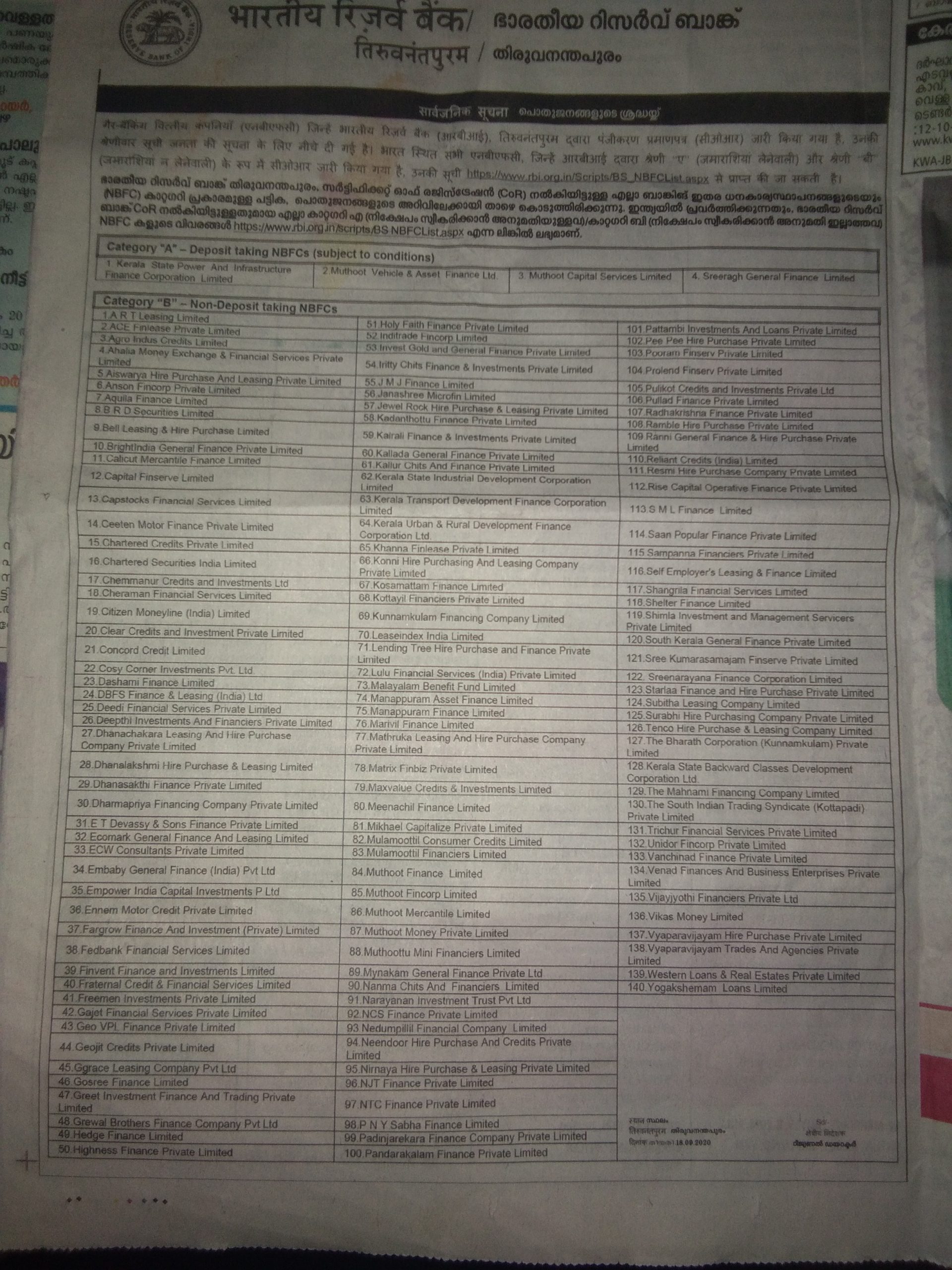 കോന്നി വാര്ത്ത ഡോട്ട് കോം : കോന്നി വകയാര് പോപ്പുലര് സാന് ഫിനാന്സ്സ് ഉള്പ്പെടെ കേരളത്തിലെ 140 വലുതും ചെറുതുമായ സ്വകാര്യ ധനകാര്യ ഫിനാന്സ്സുകള്ക്ക് നിക്ഷേപം സ്വീകരിക്കാന് അനുമതി ഇല്ലെന്ന് റിസര്വ് ബാങ്ക് തിരുവനന്തപുരം റീജിയന് പൊതു ജനത്തെ അറിയിച്ചു . കാറ്റഗറി എ വിഭാഗതില് ഉള്ള 4 സ്ഥാപനങ്ങള്ക്ക് മാത്രമേ കേരളത്തില് നിക്ഷേപം സ്വീകരിക്കാന് അനുമതി ഉള്ളൂ . കേരള സ്റ്റേറ്റ് പവര് ആന്ഡ് ഇന്ഫ്രാസ്ട്രക്ചര് ഫൈനാന്സ് കോര്പ്പറേഷന് ലിമിറ്റെഡ് , മുത്തൂറ്റ് വെഹിക്കിള് ആന്ഡ് അസെറ്റ് ഫൈനാന്സ് ലിമിറ്റഡ് , മുത്തൂറ്റ് കാപ്പിറ്റല് സെര്വീസ് ലിമിറ്റഡ് , ശ്രീരാഖ് ജനറല് ഫൈനാന്സ് ലിമിറ്റഡ് എന്നിവയ്ക്കു മാത്രം ആണ് നിക്ഷേപം സ്വീകരിക്കാന് നിലവില് അനുമതി ഉള്ളത് . കേരളത്തിലെ ബാക്കി 140 സ്വകാര്യ ധനകാര്യ സ്ഥാപനങ്ങള്ക്ക് നിക്ഷേപം സ്വീകരിക്കാന് അനുമതി ഇല്ല എന്നിരിക്കെ കോടികണക്കിന്…
