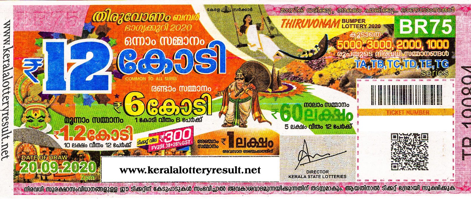 ഓണം ബമ്പർ ലോട്ടറി നറുക്കെടുപ്പിൽ ഒന്നാം സമ്മാനം ടിബി 173964 ടിക്കറ്റിന്. കൊച്ചി കടവന്ത്രയിലെ ലോട്ടറിവിൽപ്പനക്കാരനായ അളഗർസ്വാമിയാണ് ടിക്കറ്റ് വിറ്റത്. സമ്മാനാർഹനായത് ആരാണെന്ന് തിരിച്ചറിഞ്ഞിട്ടില്ല. 12 കോടിയാണ് ഒന്നാം സമ്മാനമായി ലഭിക്കുക. 300 രൂപയാണ് ഭാഗ്യക്കുറിയുടെ വില. ഉച്ചകഴിഞ്ഞ് രണ്ട് മണിക്ക് തിരുവനന്തപുരം ബേക്കറി ജംങ്ഷനിലുള്ള ഗോർക്കി ഭവനിലാണ് നറുക്കെടുപ്പ് നടന്നത്. രണ്ടാം സമ്മാനമായി ഒരു കോടി വീതം ആറുപേർക്കും മൂന്നാം സമ്മാനമായി 10 ലക്ഷം രൂപ വീതം 12 പേർക്കും ലഭിക്കും. നാലാം സമ്മാനമായി 12 പേർക്ക് 5 ലക്ഷം രൂപ വീതം നൽകും. ഒരു ലക്ഷം, 5000, 3000, 2000, 1000 രൂപയുടെ മറ്റ് അനവധി സമ്മാനങ്ങളുമുണ്ട്.