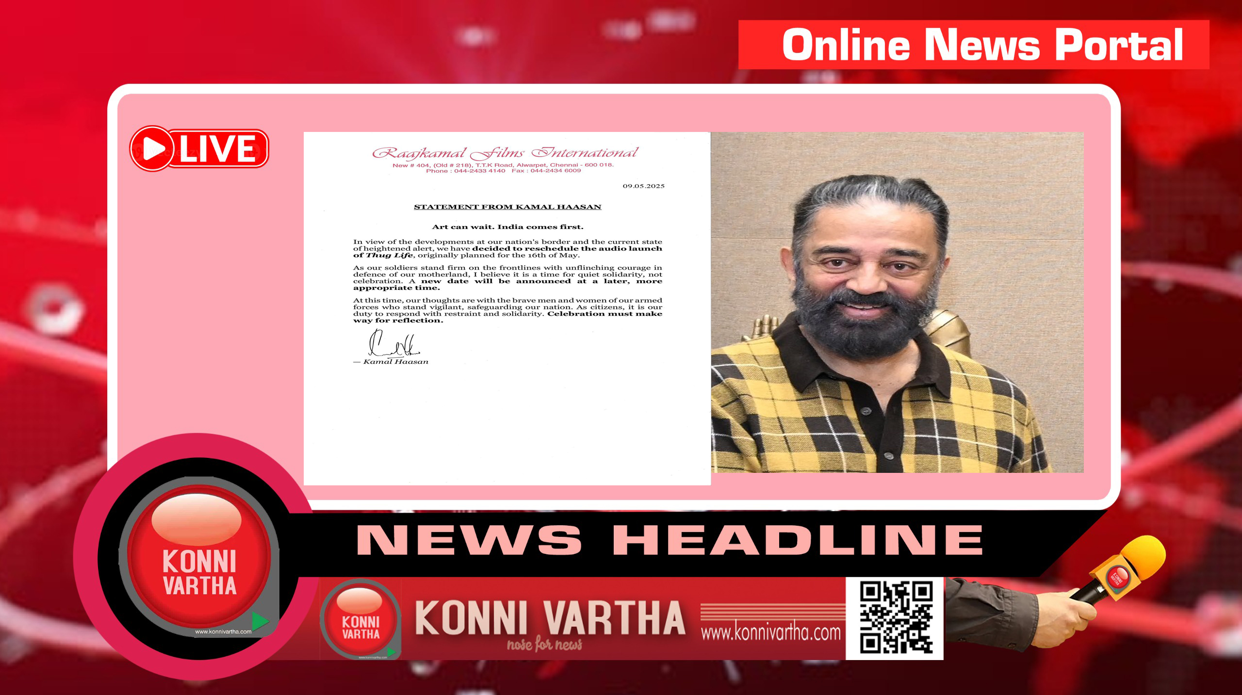 konnivartha.com: നമ്മുടെ രാജ്യത്തിന്റെ അതിർത്തിയിലെ സംഭവവികാസങ്ങളും നിലവിലെ ജാഗ്രതയും കണക്കിലെടുത്ത്, മെയ് 16 ന് നടത്താൻ ആദ്യം നിശ്ചയിച്ചിരുന്ന തഗ് ലൈഫിന്റെ ഓഡിയോ ലോഞ്ച് പുനഃക്രമീകരിക്കാൻ തീരുമാനിച്ചതായി കമൽ ഹാസൻ പത്രക്കുറിപ്പിൽ അറിയിച്ചു. നമ്മുടെ സൈനികർ നമ്മുടെ മാതൃരാജ്യത്തിന്റെ പ്രതിരോധത്തിൽ അചഞ്ചലമായ ധൈര്യത്തോടെ മുൻനിരയിൽ ഉറച്ചുനിൽക്കുന്നതിനാൽ, ഇത് ആഘോഷിക്കാനുള്ള സമയമല്ല, നിശബ്ദ ഐക്യദാർഢ്യത്തിനുള്ള സമയമാണെന്ന് ഞാൻ വിശ്വസിക്കുന്നു. പുതിയ തീയതി പിന്നീട്, കൂടുതൽ ഉചിതമായ സമയത്ത് പ്രഖ്യാപിക്കുമെന്നും കമൽ ഹാസൻ കൂട്ടിച്ചേർത്തു. ഈ സമയത്ത്, നമ്മുടെ രാജ്യത്തെ സംരക്ഷിക്കുന്നതിനായി ജാഗ്രതയോടെ നിലകൊള്ളുന്ന നമ്മുടെ സായുധ സേനയിലെ ധീരരായ പുരുഷന്മാരുടെയും സ്ത്രീകളുടെയും ചിന്തകൾക്കൊപ്പമാണ്. പൗരന്മാരെന്ന നിലയിൽ, സംയമനത്തോടെയും ഐക്യദാർഢ്യത്തോടെയും പ്രതികരിക്കേണ്ടത് നമ്മുടെ കടമയാണ്. ആഘോഷം പ്രതിഫലനത്തിന് വഴിയൊരുക്കണം എന്നും കമൽ ഹാസൻ സൂചിപ്പിക്കുന്നു. ജൂൺ 5നാണ് തഗ് ലൈഫ് തിയേറ്ററുകളിലേക്കെത്തുന്നത്. സിലംബരശൻ, തൃഷ, നാസർ, ജോജു ജോർജ്,…