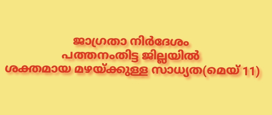 Read Moreജാഗ്രതാ നിർദേശം:പത്തനംതിട്ട ജില്ലയിൽ ശക്തമായ മഴയ്ക്കുള്ള സാധ്യത(മെയ് 11)