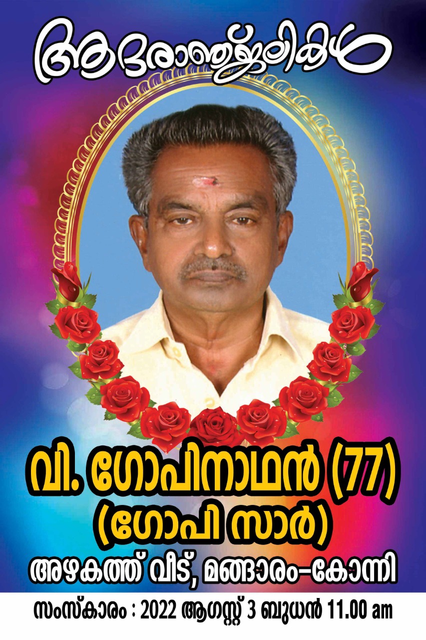 കോന്നി മങ്ങാരം അഴകത്തു വീട്ടിൽ വി ഗോപിനാഥൻ(ഗോപി സാർ 77)നിര്യാതനായി