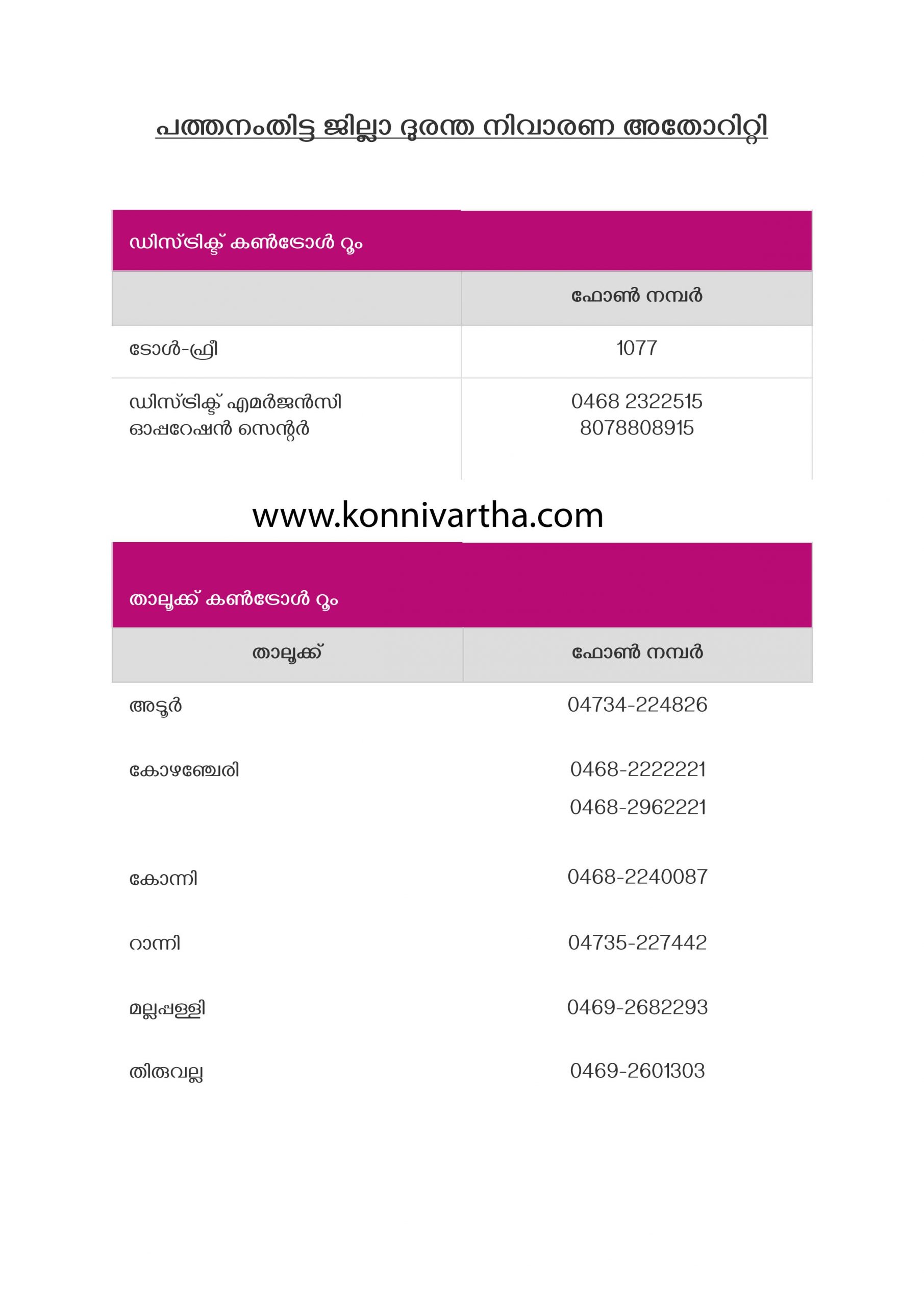 കനത്ത മഴ മുന്നറിയിപ്പ് : പത്തനംതിട്ട ജില്ലാ ദുരന്ത നിവാരണ അതോറിറ്റി കണ്ട്രോള് റൂം തുറന്നു .ജില്ലയിലെ എല്ലാ താലൂക്കിലും കണ്ട്രോള് റൂം തുറന്നു konnivartha.com : കനത്ത മഴയുടെ സാഹചര്യത്തില് പത്തനംതിട്ട ജില്ലയിലെ എല്ലാ താലൂക്ക് ഓഫീസിലും ഇരുപത്തി നാല് മണിക്കൂറും പ്രവര്ത്തിക്കുന്ന കണ്ട്രോള് റൂം തുറന്നു.ഏതു അടിയന്തര സാഹചര്യത്തിലും ഈ നമ്പരുമായി ബന്ധപ്പെടാം ട്രോള് ഫ്രീ നമ്പര് : 1077 പത്തനംതിട്ട ജില്ലാ എമര്ജന്സി നമ്പര് : 0468 2322515,8078808915 താലൂക്ക് കണ്ട്രോള് റൂം നമ്പറുകള്(www.konnivartha.com ) കോന്നി : 0468-2240087 അടൂർ :04734-224826 കോഴഞ്ചേരി : 0468-2222221, 0468-2962221 റാന്നി :04735-227442 മല്ലപ്പള്ളി: 0469-2682293 തിരുവല്ല: 0469-2601303 www.konnivartha.com