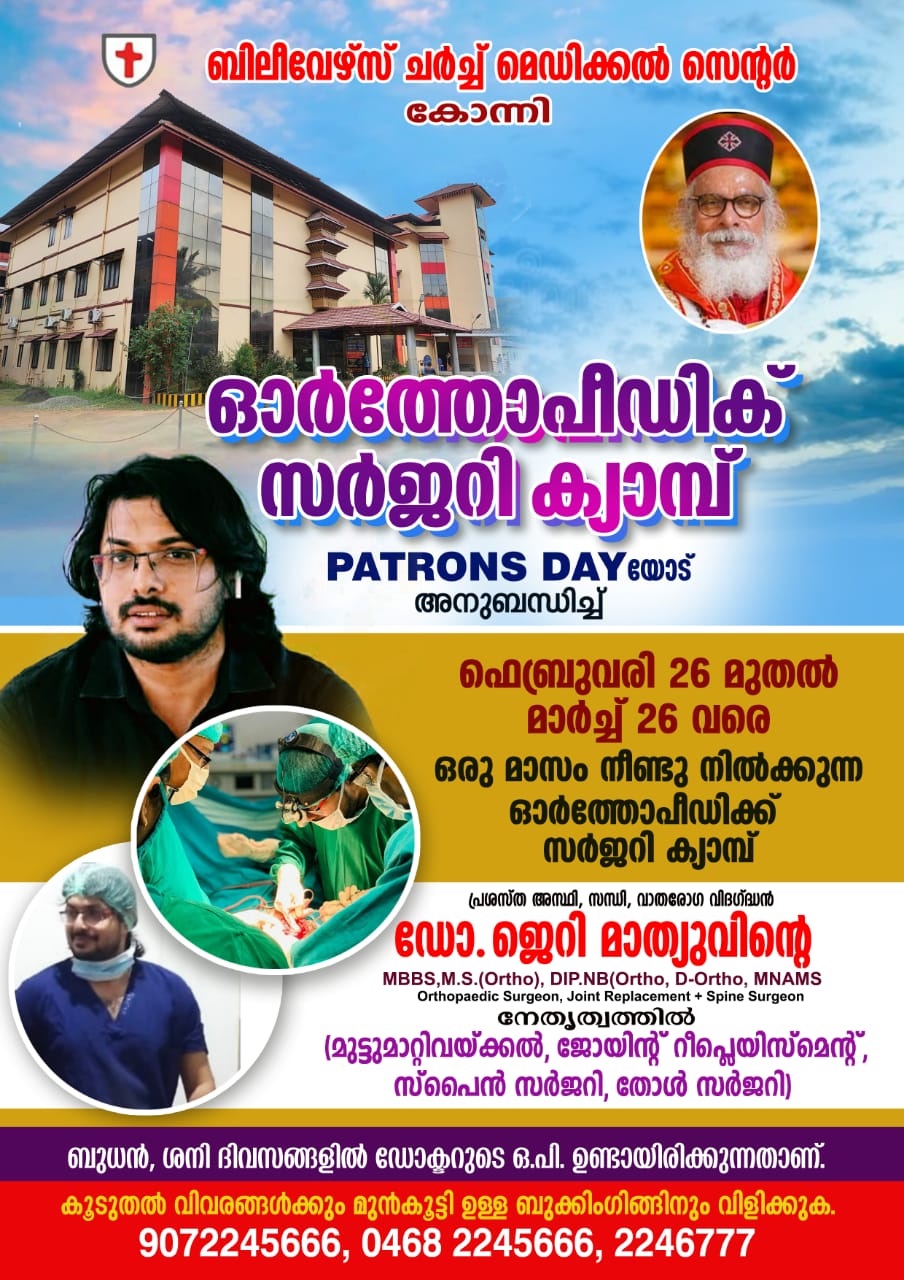 കോന്നി ബിലീവേഴ്സ് ഹോസ്പിറ്റലിൽ ഒരു മാസം നീണ്ടു നിൽക്കുന്ന ഓർത്തോപീഡിക് ക്യാമ്പ് മാർച്ച് 26 വരെ നടക്കും . പ്രശസ്ത അസ്ഥി ,സന്ധി ,വാത രോഗ വിദഗ്ധൻ ഡോക്ടർ ജെറി മാത്യു ക്യാമ്പിന് നേതൃത്വം നൽകുന്നു . മുട്ടുമാറ്റിവെയ്ക്കല് ,ജോയിന്റ് റീപ്ലയിസ്മെന്റ് ,സ്പൈന് സര്ജറി ,തോള് സര്ജറി തുടങ്ങിയവ ഉണ്ട് . കൂടുതൽ വിവരങ്ങൾക്കും ബുക്കിങ്ങിനുമായി വിളിക്കാം 0468 2245666 ,9072245666 ബുധന് ,ശനി ദിവസങ്ങളില് ഡോ ജെറി മാത്യൂവിന്റെ ഒ പി പ്രവര്ത്തിച്ചു വരുന്നു