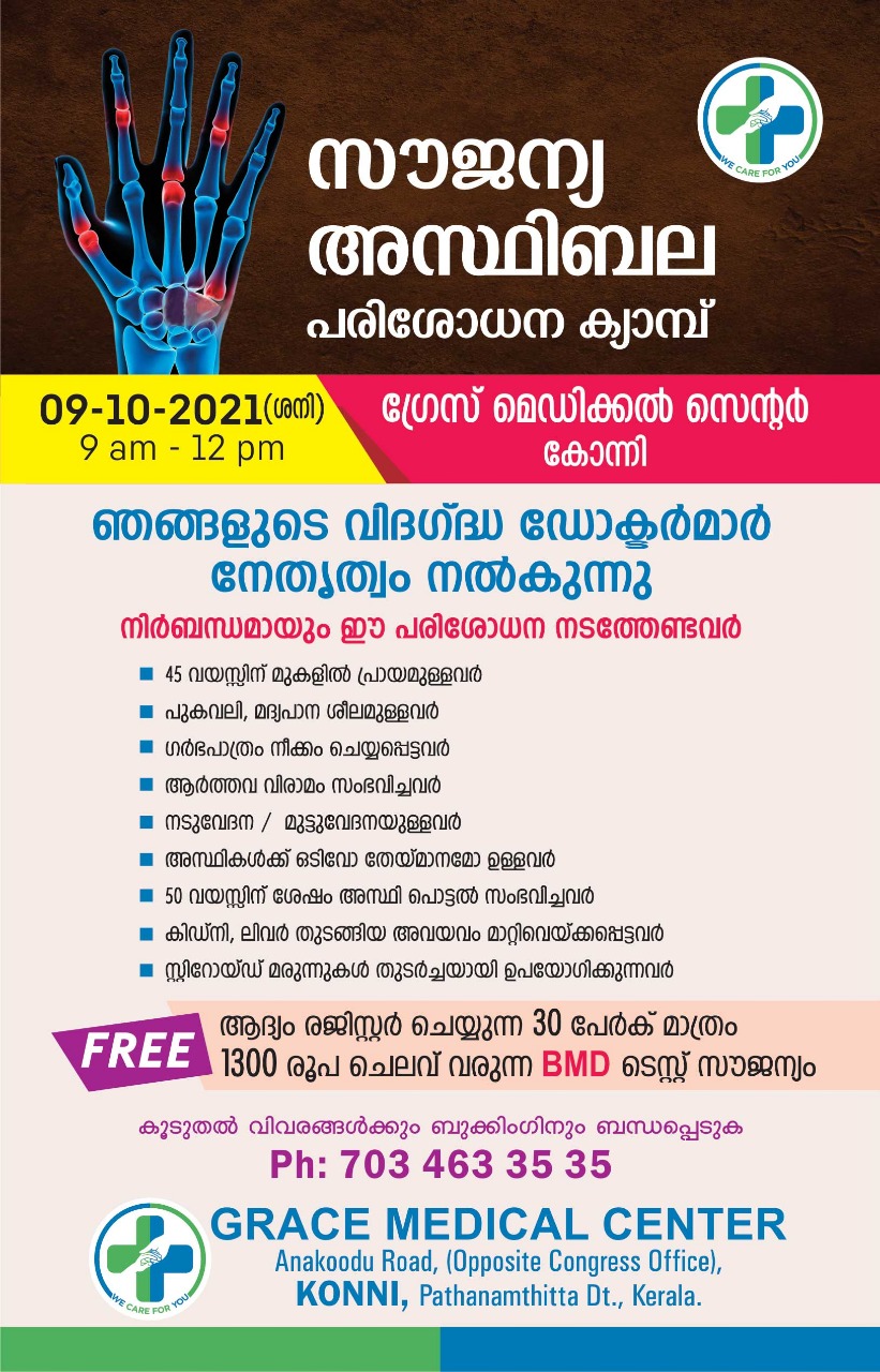 കോന്നിയില് സൗജന്യ അസ്ഥിബല പരിശോധന ക്യാമ്പ്(09/10/2021 ശനി ) കോന്നിയില് സൗജന്യ അസ്ഥിബല പരിശോധന ക്യാമ്പ്(09/10/2021 ശനി ) നടക്കും . രാവിലെ 9 മണി മുതല് ഉച്ചയ്ക്ക് 12 മണി വരെ . ആദ്യം രജിസ്റ്റര് ചെയ്യുന്ന 30 പേര്ക്ക് 1300 രൂപ ചെലവ് വരുന്ന BMD ടെസ്റ്റ് സൗജന്യം കൂടുതല് വിവരങ്ങള്ക്കും ബുക്കിംഗിനും ബന്ധപ്പെടുക :ഫോണ് : 703 463 35 35 GRACE MEDICAL CENTER kONNIpathanamthitta (dist )kerala phone : 7034633535, 0468 299 35 35