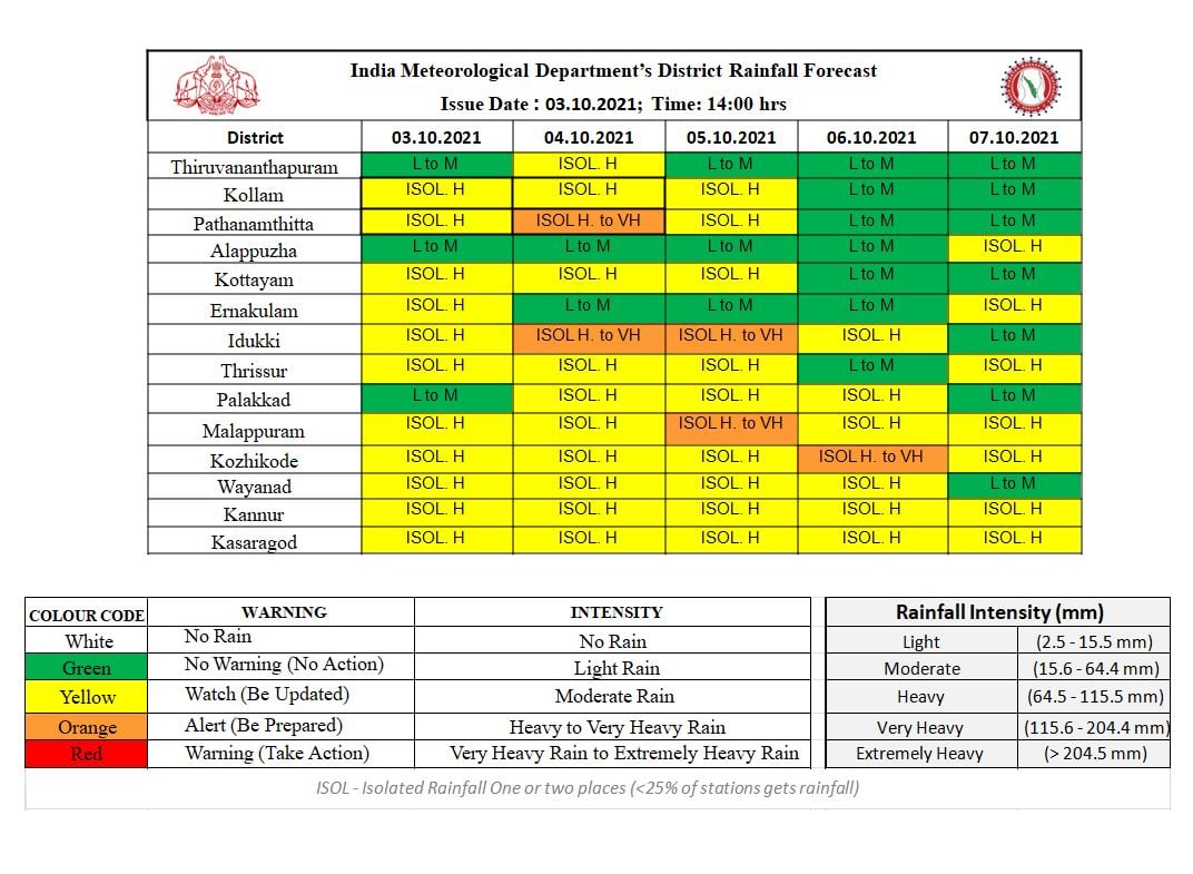 konnivartha.com :ശക്തമായ മഴയ്ക്ക് സാധ്യതയെന്ന് കേന്ദ്ര കാലാവസ്ഥാ നിരീക്ഷണ കേന്ദ്രത്തിന്റെ മുന്നറിയിപ്പ്. പത്തനംതിട്ട, ഇടുക്കി ജില്ലകളില് നാളെ ഓറഞ്ച് അലേര്ട്ട് പ്രഖ്യാപിച്ചു. നാളെ പത്ത് ജില്ലകളിലും മറ്റന്നാള് ആറ് ജില്ലകളിലും യെല്ലോ അലേര്ട്ടുണ്ട്. ചൊവ്വാഴ്ച ഇടുക്കി, മലപ്പുറം ജില്ലകളിലും ബുധനാഴ്ച കോഴിക്കോടും ഓറഞ്ച് അലേര്ട്ട് പ്രഖ്യാപിച്ചിട്ടുണ്ട്. ചൊവ്വാഴ്ചയോടെ അറബിക്കടലില് ന്യൂനമര്ദം രൂപപ്പെടാന് സാധ്യതയുണ്ടെന്നാണ് മുന്നറിയിപ്പ്. കേരള തീരത്ത് മത്സ്യബന്ധനത്തിന് വിലക്കില്ല. പത്തനംതിട്ട, കോട്ടയം, ഇടുക്കി, മലപ്പുറം, കോഴിക്കോട്, വയനാട് ജില്ലകളില് ഇന്ന് യല്ലോ അലര്ട്ടുണ്ട്. പൊതുജനങ്ങള് ഇടിമിന്നല് ജാഗ്രതാ നിര്ദേശങ്ങള് പാലിക്കണമെന്ന് സംസ്ഥാന ദുരന്തനിവാരണ അതോറിറ്റി അറിയിച്ചു. കേന്ദ്ര കാലാവസ്ഥാവകുപ്പിന്റെ അടുത്ത 5 ദിവസത്തേക്കുള്ള പുതുക്കിയ മഴ സാധ്യത പ്രവചനം കേരളത്തിൽ അതിശക്തമായ മഴയ്ക്ക് (Very Heavy Rainfall) സാധ്യത – വിവിധ ജില്ലകളിൽ ഓറഞ്ച് അലേർട്ട് പ്രഖ്യാപിച്ചു. 04-10-2021: പത്തനംതിട്ട, ഇടുക്കി 05-10-2021: ഇടുക്കി,…