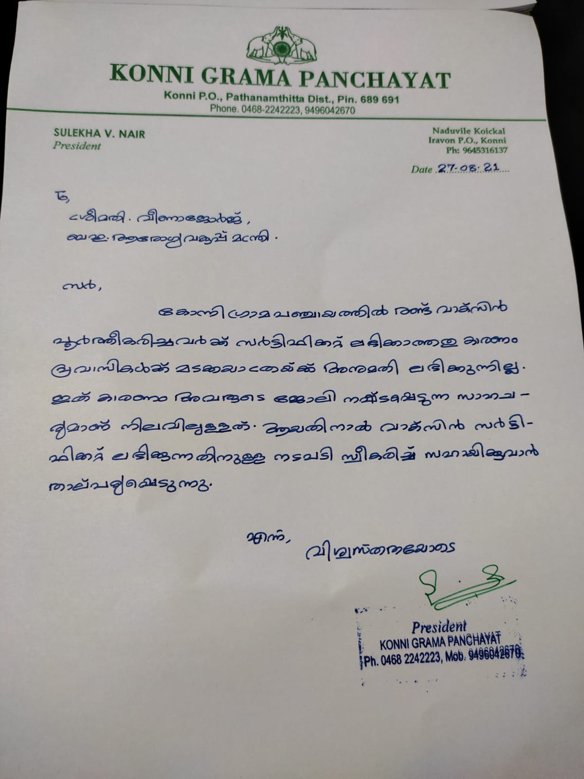 കോന്നിയില് രണ്ടു ഡോസ് വാക്സിന് പൂര്ത്തിയായവര്ക്ക് സര്ട്ടിഫിക്കറ്റ് ലഭിക്കണം കോന്നി വാര്ത്ത ഡോട്ട് കോം : കോന്നി പഞ്ചായത്തില് രണ്ടു ഡോസ് വാക്സിന് ലഭിച്ചവര്ക്ക് സര്ട്ടിഫിക്കറ്റ് ലഭിക്കണം എന്നാവശ്യം ഉന്നയിച്ച് ആരോഗ്യവകുപ്പ് മന്ത്രിയ്ക്ക് കോന്നി പഞ്ചായത്ത് പ്രസിഡണ്ട് സുലേഖ വി നായര് കത്തയച്ചു . സര്ട്ടിഫിക്കറ്റ് ലഭിക്കാത്തത് കാരണം പ്രവാസികള്ക്ക് മടക്കയാത്രയ്ക്ക് അനുമതി ലഭിക്കുന്നില്ല . ഇത് മൂലം ജോലി നഷ്ടപ്പെടുന്ന സാഹചര്യമാണ് നിലവില് ഉള്ളത് . ഇതിനാല് വാക്സിന് പൂര്ത്തിയായവര്ക്ക് സര്ട്ടിഫിക്കറ്റ് ലഭിക്കാന് നടപടി സ്വീകരിക്കണം എന്നാണ് ആവശ്യം .
