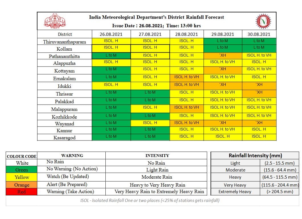 കേരളത്തിൽ അതിശക്തമായ മഴയ്ക്ക് (Very Heavy Rainfall) സാധ്യത – വിവിധ ജില്ലകളിൽ ഓറഞ്ച് അലേർട്ട് പ്രഖ്യാപിച്ചു. 28-08-2021: എറണാകുളം, ഇടുക്കി, മലപ്പുറം, വയനാട് 29-08-2021: പത്തനംതിട്ട, കോട്ടയം, ഇടുക്കി, വയനാട് 30-08-2021: ഇടുക്കി, തൃശൂർ, വയനാട് എന്നീ ജില്ലകളിൽ കേന്ദ്ര കാലാവസ്ഥ വകുപ്പ് ഓറഞ്ച് അലേർട്ട് പ്രഖ്യാപിച്ചിരിക്കുന്നു. ശക്തമായതോ അതിശക്തമായതോ ആയ മഴയാണ് പ്രവചിക്കപ്പെട്ടിരിക്കുന്നത്. ഒറ്റപ്പെട്ടയിടങ്ങളിൽ 24 മണിക്കൂറിൽ 64.5 mm മുതൽ 204.4 mm വരെ മഴ ലഭിക്കാനുള്ള സാധ്യതയാണ് അതിശക്തമായ മഴ എന്നത് കൊണ്ട് അർത്ഥമാക്കുന്നത്. 26-08-2021: തിരുവനന്തപുരം, കൊല്ലം, ആലപ്പുഴ, ഇടുക്കി 27-08-2021:തിരുവനന്തപുരം, കൊല്ലം, പത്തനംതിട്ട, ആലപ്പുഴ, കോട്ടയം, എറണാകുളം, ഇടുക്കി, മലപ്പുറം, വയനാട് 28-08-2021:തിരുവനന്തപുരം, കൊല്ലം, പത്തനംതിട്ട, ആലപ്പുഴ, കോട്ടയം, തൃശൂർ, പാലക്കാട്, കോഴിക്കോട്, വയനാട്, കണ്ണൂർ, കാസറഗോഡ് 29-08-2021:ആലപ്പുഴ, എറണാകുളം, തൃശൂർ, പാലക്കാട്, മലപ്പുറം, കോഴിക്കോട്, കണ്ണൂർ, കാസറഗോഡ്…