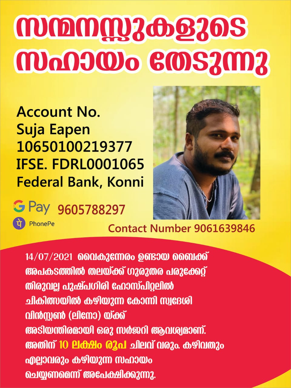 കോന്നി വാര്ത്ത ഡോട്ട് കോം : ബൈക്ക് അപകടത്തില് തലയ്ക്ക് ഗുരുതരമായി പരിക്ക് പറ്റിയ കോന്നി അരുവാപ്പുലം പന്ത്രണ്ടാം വാര്ഡില് പുളിഞ്ചാണി അടവിക്കുഴി പ്ലാം തോട്ടത്തില് വിന്സ്റ്റണ് (ലിനോ ) അടിയന്തിര സര്ജറി ആവശ്യമായി വന്നിരിക്കുന്നു . 10 ലക്ഷം രൂപ അടിയന്തിരമായി ആവശ്യം ഉണ്ട് . എല്ലാവരുടെയും സഹായം ആവശ്യം ഉണ്ട് .