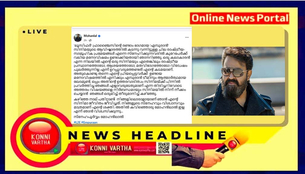 എമ്പുരാൻ സിനിമാ വിവാദത്തിൽ ഖേദം പ്രകടിപ്പിച്ച് നടൻ മോഹന്ലാൽ. തന്റെ പ്രിയപ്പെട്ടവർക്ക് ഉണ്ടായ മനോവിഷമത്തിൽ തനിക്കും എമ്പുരാൻ ടീമിനും ആത്മാർഥമായ ഖേദമുണ്ടെന്നു സമൂഹമാധ്യമത്തിലെ പോസ്റ്റിൽ മോഹൻലാൽ വ്യക്തമാക്കി.വിവാദ വിഷയങ്ങളെ സിനിമയിൽനിന്നു നീക്കം ചെയ്യാൻ തീരുമാനിച്ചു കഴിഞ്ഞു. ജനങ്ങളുടെ സ്നേഹവും വിശ്വാസവും മാത്രമാണ് തന്റെ ശക്തിയെന്നും മോഹൻലാൽ പറഞ്ഞു. പോസ്റ്റിന്റെ പൂർണരൂപം:’ലൂസിഫർ’ ഫ്രാഞ്ചൈസിൻ്റെ രണ്ടാം ഭാഗമായ ‘എമ്പുരാൻ’ സിനിമയുടെ ആവിഷ്കാരത്തിൽ കടന്നു വന്നിട്ടുള്ള ചില രാഷ്ട്രീയ-സാമൂഹിക പ്രമേയങ്ങൾ എന്നെ സ്നേഹിക്കുന്നവരിൽ കുറേപേർക്ക് വലിയ മനോവിഷമം ഉണ്ടാക്കിയതായി ഞാനറിഞ്ഞു. ഒരു കലാകാരൻ എന്ന നിലയിൽ എൻ്റെ ഒരു സിനിമയും ഏതെങ്കിലും രാഷ്ട്രീയ പ്രസ്ഥാനത്തോടോ, ആശയത്തോടോ, മതവിഭാഗത്തോടോ വിദ്വേഷം പുലർത്തുന്നില്ല എന്ന് ഉറപ്പുവരുത്തേണ്ടത് എൻ്റെ കടമയാണ്. അതുകൊണ്ടു തന്നെ എൻ്റെ പ്രിയപ്പെട്ടവർക്ക് ഉണ്ടായ മനോവിഷമത്തിൽ എനിക്കും എമ്പുരാൻ ടീമിനും ആത്മാർത്ഥമായ ഖേദമുണ്ട്, ഒപ്പം അതിൻ്റെ ഉത്തരവാദിത്വം സിനിമയ്ക്ക് പിന്നിൽ പ്രവർത്തിച്ച ഞങ്ങൾ…