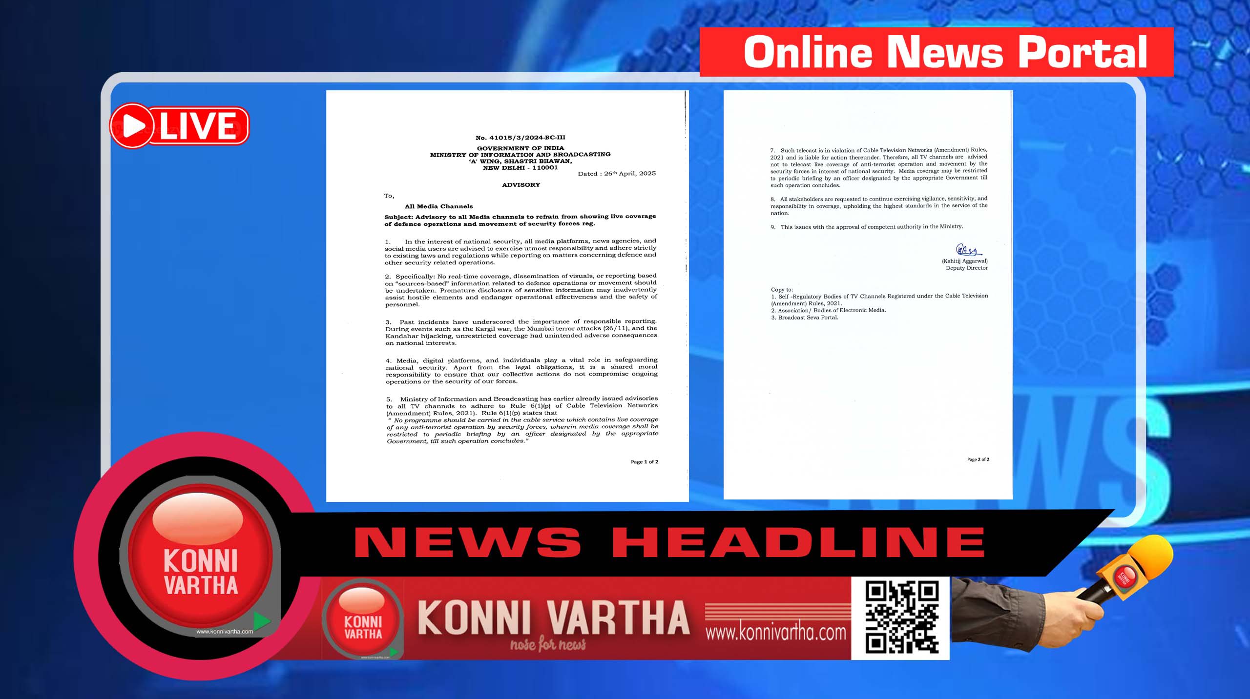 konnivartha.com: സുരക്ഷാ സേനയുടെ നീക്കങ്ങളുടെയും പ്രതിരോധ പ്രവർത്തനങ്ങളുടെയും തത്സമയ സംപ്രേഷണത്തിനെതിരെ മാധ്യമങ്ങൾക്ക് മുന്നറിയിപ്പ് നൽകി കേന്ദ്ര വാർത്താ വിതരണ മന്ത്രാലയം.ദേശീയ സുരക്ഷയെ മാനിച്ച് മാധ്യമങ്ങളും വാർത്താ ഏജൻസികളും സോഷ്യൽ മീഡിയ ഉപയോക്താക്കളും ഇത്തരം കാര്യങ്ങൾ റിപ്പോർട്ട് ചെയ്യുമ്പോൾ നിലവിലുള്ള നിയമങ്ങളും ചട്ടങ്ങളും കർശനമായി പാലിക്കണമെന്നാണ് സർക്കാർ നിർദേശം. പ്രതിരോധ പ്രവർത്തനങ്ങളുമായോ നീക്കങ്ങളുമായോ ബന്ധപ്പെട്ട കാര്യങ്ങളുടെ തത്സമയ കവറേജ്, ദൃശ്യങ്ങളുടെ പ്രചാരണം, വാർത്തയുടെ ഉറവിടം വെളിപ്പെടുത്തുന്ന റിപ്പോർട്ടിങ് എന്നിവ പാടില്ല.ഇത്തരം തന്ത്രപരമായ വിവരങ്ങള് മുൻകൂട്ടി വെളിപ്പെടുത്തുന്നത് ശത്രു ഘടകങ്ങളെ സഹായിക്കുകയും ഉദ്യോഗസ്ഥരുടെ സുരക്ഷ അപകടത്തിലാക്കുകയും ചെയ്യും. കാർഗിൽ യുദ്ധം, മുംബൈ ഭീകരാക്രമണം, കാണ്ഡഹാർ വിമാന റാഞ്ചൽ തുടങ്ങിയ സംഭവങ്ങളിൽ ഇത്തരം റിപ്പോർട്ടിങ് പ്രശ്നങ്ങളുണ്ടാക്കിയതായി എടുത്തുപറയുന്നുണ്ട്.2021ലെ കേബിൾ ടെലിവിഷൻ നെറ്റ്വർക്ക്സ് (ഭേദഗതി) നിയമങ്ങളിലെ ചട്ടം 6(1) (പി) പാലിക്കണമെന്ന് കേന്ദ്ര വാർത്താ വിതരണ മന്ത്രാലയം എല്ലാ ടിവി ചാനലുകൾക്കും…