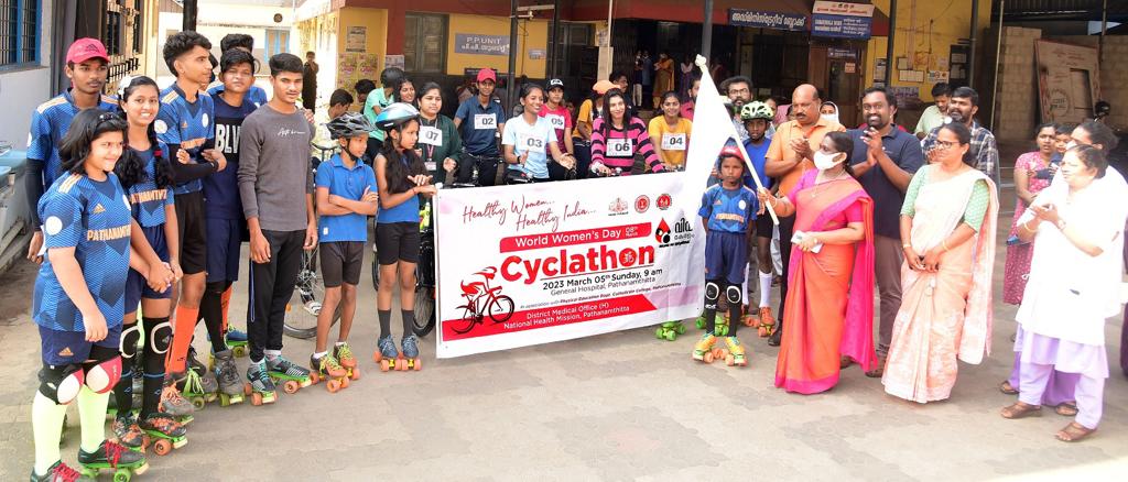 വിവ കേരളത്തിന്റേയും ലോകവനിതാദിനത്തിന്റെയും ഭാഗമായി പത്തനംതിട്ട ജില്ലാ മെഡിക്കല് ഓഫീസും, ദേശീയ ആരോഗ്യദൗത്യവും സംയുക്തമായി സംഘടിപ്പിച്ച സൈക്ലത്തോണും റോളര് സ്ക്കേറ്റിംഗും ആവേശമായി. പത്തനംതിട്ട ജനറല് ആശുപത്രിയില് നിന്നും ആരംഭിച്ച് ഗാന്ധി സ്ക്വയര്, സ്റ്റേഡിയം ജംഗ്ഷന് വഴി ജനറല് ആശുപത്രിയില് തിരിച്ചെത്തും വിധമായിരുന്നു സൈക്ലത്തോണും റോളര് സ്ക്കേറ്റിംഗും. പരിപാടി ജില്ലാ മെഡിക്കല് ഓഫീസര് (ആരോഗ്യം) ഡോ. എല്. അനിതകുമാരി ഫ്ളാഗ് ഓഫ് ചെയ്തു. രാജ്യത്തുണ്ടാകുന്ന മരണങ്ങളില് അറുപതു ശതമാനത്തിനു മുകളില് പകര്ച്ചേതര വ്യാധി മൂലമാണെന്നും ഇതിനുകാരണം അനാരോഗ്യകരമായ ജീവിതശൈലി, പുകയിലയുടേയും മദ്യത്തിന്റെയും ഉപയോഗം, വ്യായാമക്കുറവ്, വായു മലിനീകരണം എന്നിവയൊക്കെയാണെന്നും ജില്ലാ മെഡിക്കല് ഓഫീസര് ഓര്മ്മപ്പെടുത്തി. സ്ത്രീകളിലെ വിളര്ച്ച കണ്ടുപിടിച്ച് പരിഹരിക്കുന്ന ‘വിവ കേരളം’ കാമ്പയിന് നടക്കുന്ന ഈ കാലയളവില് സൈക്ലത്തോണ് പോലെയുളള പ്രചാരണ പരിപാടികള്ക്ക് കൂടുതല് പ്രാധാന്യം ഉണ്ടെന്നും ഡിഎംഒ പറഞ്ഞു. പത്തനംതിട്ട കാത്തോലിക്കേറ്റ് കോളജിലെ ഫിസിക്കല്…