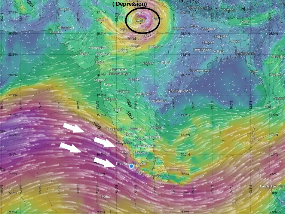 കേരളത്തിലെ എല്ലാ ജില്ലകളിലും ഒറ്റപ്പെട്ടയിടങ്ങളിൽ ഇടത്തരം മഴയ്ക്കും മണിക്കൂറിൽ 40 കിലോമീറ്റർ വരെ വേഗതയിൽ ശക്തമായ കാറ്റിനും സാധ്യതയുണ്ടെന്ന് കേന്ദ്ര കാലാവസ്ഥ വകുപ്പ് അറിയിച്ചു. Moderate rainfall with strong surface wind speed occasionally reaching up to 40 kmph (in Gusts) is likely to occur at one or two places in all districts of Kerala. വടക്ക് പടിഞ്ഞാറൻ മധ്യപ്രദേശിനും തെക്ക് പടിഞ്ഞാറൻ ഉത്തർപ്രദേശിനും മുകളിലായി തീവ്ര ന്യുനമർദ്ദം സ്ഥിതിചെയ്യുന്നു. തെക്കൻ തീരദേശ ആന്ധ്രാപ്രദേശിന് മുകളിലായി ഉയർന്ന ലെവലിൽ ചക്രവാത ചുഴി സ്ഥിതിചെയ്യുന്നു. മറ്റൊരു ചക്രവാത ചുഴി മധ്യ മഹാരാഷ്ട്രക്കു മുകളിൽ സ്ഥിതിചെയ്യുന്നു. ജൂലൈ 24 ഓടെ വടക്കൻ ബംഗാൾ ഉൾക്കടലിൽ പുതിയ ന്യുനമർദ്ദം രൂപപ്പെടാൻ സാധ്യത