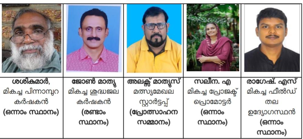 ഒന്നാം സ്ഥാനം ഉൾപ്പടെ ആകെ അഞ്ച് വിഭാഗങ്ങളിൽ ആലപ്പുഴ ജില്ല അവാർഡ് സ്വന്തമാക്കി. പിന്നാമ്പുറ മത്സ്യകർഷകൻ, ഫീൽഡ് ഓഫീസർ, പ്രൊജക്റ്റ് പ്രൊമോട്ടർ എന്നീ മൂന്ന് വിഭാഗങ്ങളിലാണ് ജില്ലയ്ക്ക് ഒന്നാം സ്ഥാനം. പതിമൂന്ന് വർഷങ്ങളായി മത്സ്യകൃഷി രംഗത്ത് സജീവമായ കാർത്തികപ്പള്ളി മൈത്രി ഫാം ഉടമ ശശികുമാർ മികച്ച പിന്നാമ്പുറ കർഷകനായി. പത്ത് വർഷക്കാലമായി തുടർച്ചയായി കരിമീൻ, വരാൽ തുടങ്ങി വിപണി മൂല്യമുള്ള മത്സ്യങ്ങളെ വിജയകരമായി കൃഷി ചെയ്യുന്ന ജോൺ മാത്യു, ബുധനൂർ ആണ് മികച്ച രണ്ടാമത്തെ ശുദ്ധജല കർഷകൻ . ബയോഫ്ളോക്ക് സാങ്കേതിക വിദ്യയുടെ സാധ്യതകളെ പ്രയോജനപ്പെടുത്തി വ്യാവസായിക അടിസ്ഥാനത്തിൽ മത്സ്യകൃഷി ചെയ്യുകയും മൂല്യ വർദ്ധിത ഉൽപ്പന്നങ്ങൾ മാർക്കറ്റിലെത്തിക്കുകയും ചെയ്യുന്ന അലക്സ് മാത്യുസ്,അമ്പലപ്പുഴ, മികച്ച മത്സ്യമേഖല സ്റ്റാർട്ടപ്പിനുള്ള പ്രോൽസാഹന സമ്മാനത്തിന് അർഹനായി. തൃക്കുന്നപ്പുഴ മത്സ്യഭവനിലെ അക്വാകൾച്ചർ പ്രൊമോട്ടറായ എ സലീനയാണ് മികച്ച പ്രോജക്ട് പ്രൊമോട്ടർ. ചേർത്തല…