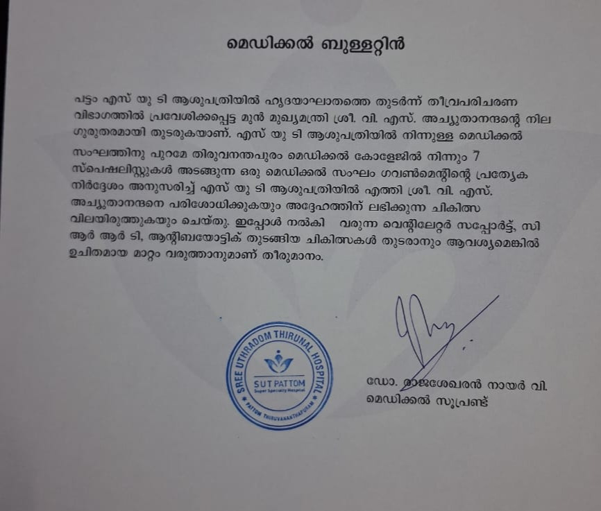 മുൻമുഖ്യമന്ത്രി വി.എസ്. അച്യുതാനന്ദന്റെ ആരോഗ്യനില അതിഗുരുതരമായി തുടരുന്നതായി മെഡിക്കൽ ബുള്ളറ്റിൻ. പട്ടം എസ്.യു.ടി. ആശുപത്രിയില് ഹൃദയാഘാതത്തെ തുടര്ന്ന് തീവ്രപരിചരണ വിഭാഗത്തില് ചികിത്സയിലാണ് . എസ്.യു.ടി. ആശുപത്രിയിൽനിന്നുള്ള മെഡിക്കൽ സംഘത്തിനുപുറമെ തിരുവനന്തപുരം മെഡിക്കൽ കോളേജിൽനിന്ന് ഏഴ് വിദഗ്ധരടങ്ങുന്ന മെഡിക്കൽ സംഘം സർക്കാരിന്റെ പ്രത്യേക നിർദേശപ്രകാരം എസ്.യു.ടി. ആശുപത്രിയിൽ എത്തിയിട്ടുണ്ട്. നിലവിൽ നൽകിവരുന്ന വെന്റിലേറ്റർ സപ്പോർട്ട്, സിആർആർടി, ആന്റിബയോട്ടിക്കുകൾ തുടങ്ങിയ ചികിത്സകൾ തുടരാനും ആവശ്യമെങ്കിൽ ഉചിതമായ മാറ്റംവരുത്താനുമാണ് തീരുമാനമെന്ന് മെഡിക്കൽ ബുള്ളറ്റിനിൽ വ്യക്തമാക്കുന്നു.