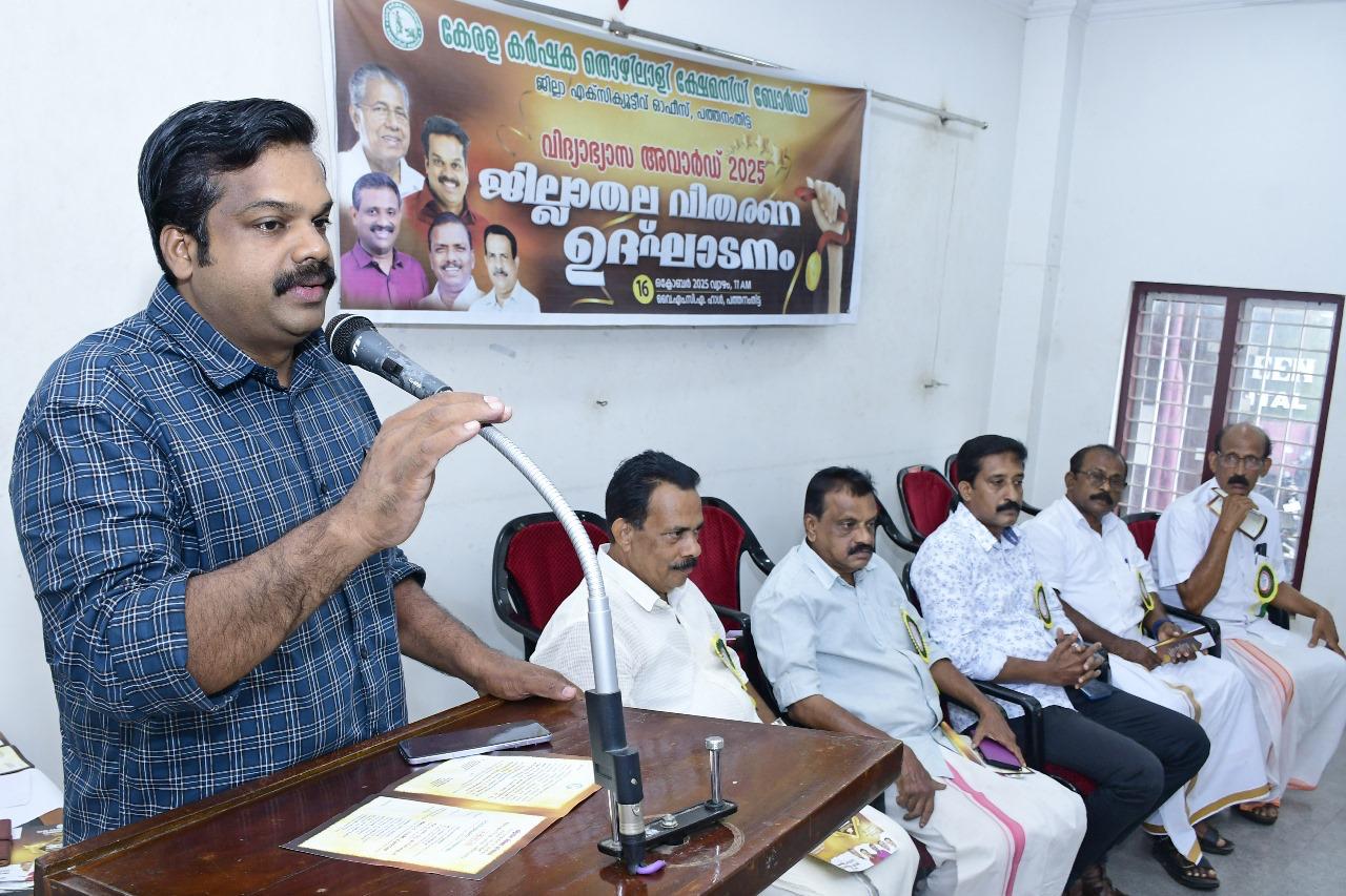 കേരള കര്‍ഷകതൊഴിലാളി ക്ഷേമനിധി അംഗങ്ങളുടെ മക്കളില്‍ എസ് എസ് എല്‍ സി /പ്ലസ് ടു പരീക്ഷയില്‍ ഉന്നത വിജയം നേടിയ കുട്ടികള്‍ക്കുളള വിദ്യാഭ്യാസ അവാര്‍ഡ് വിതരണത്തിന്റെ ജില്ലാതല ഉദ്ഘാടനം പത്തനംതിട്ട വൈഎംസിഎ ഹാളില്‍ അഡ്വ.കെ.യു.ജനീഷ് കുമാര്‍ എംഎല്‍എ നിര്‍വഹിച്ചു. ആനുകൂല്യങ്ങളുടെ വിതരണവും മുഖ്യപ്രഭാഷണവും പത്തനംതിട്ട മുനിസിപ്പല്‍ ചെയര്‍മാന്‍ അഡ്വ. ടി. സക്കീര്‍ ഹുസൈന്‍ നിര്‍വഹിച്ചു. കേരളാ കര്‍ഷകതൊഴിലാളി ക്ഷേമനിധി ബോര്‍ഡ് ഡയറക്ടര്‍ വര്‍ഗീസ് ഉമ്മന്‍ അധ്യക്ഷനായി. ജില്ലാ എക്‌സിക്യൂട്ടീവ് ഓഫീസര്‍ റ്റി.ആര്‍.ബിജുരാജ്, ബീനാ ബാബു, കെ.എസ്.കെ.റ്റി.യു. ജില്ലാ പ്രസിഡന്റ് പി.എസ്.കൃഷ്ണകുമാര്‍ എന്നിവര്‍ പങ്കെടുത്തു.