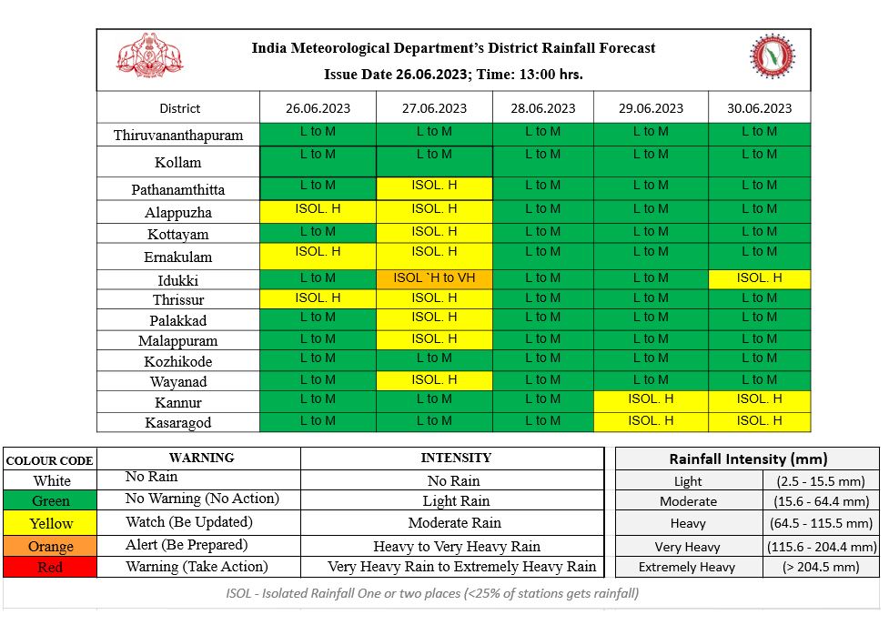 വിവിധ ജില്ലകളിൽ കേന്ദ്ര കാലാവസ്ഥ വകുപ്പ് ഓറഞ്ച്, മഞ്ഞ അലർട്ട് പ്രഖ്യാപിച്ചിരിക്കുന്നു. ഒറ്റപ്പെട്ടയിടങ്ങളിൽ അതിശക്തമായ മഴക്കുള്ള സാധ്യതയാണ് പ്രവചിച്ചിരിക്കുന്നത്. 24 മണിക്കൂറിൽ 115.6 mm മുതൽ 204.4 mm വരെ മഴ ലഭിക്കുമെന്നാണ് അതിശക്തമായ മഴ (Very Heavy Rainfall) എന്നത് കൊണ്ട് കാലാവസ്ഥ വകുപ്പ് അർത്ഥമാക്കുന്നത്. 27-06-2023: പത്തനംതിട്ട, ആലപ്പുഴ, കോട്ടയം, എറണാകുളം, തൃശ്ശൂർ, പാലക്കാട്, മലപ്പുറം, വയനാട് 29-06-2023: കണ്ണൂർ, കാസറഗോഡ് 30-06-2023: ഇടുക്കി, കണ്ണൂർ, കാസറഗോഡ് എന്നീ ജില്ലകളിൽ കേന്ദ്ര കാലാവസ്ഥാവകുപ്പ് മഞ്ഞ അലർട്ട് പ്രഖ്യാപിച്ചു. ഒറ്റപ്പെട്ട ശക്തമായ മഴയ്ക്കുള്ള സാധ്യതയാണ് പ്രവചിക്കപ്പെട്ടിരിക്കുന്നത്. 24 മണിക്കൂറിൽ 64.5 മില്ലിമീറ്ററിൽ മുതൽ 115.5 മില്ലിമീറ്റർ വരെ മഴ ലഭിക്കുന്ന സാഹചര്യത്തെയാണ് ശക്തമായ മഴ എന്നത് കൊണ്ട് അർത്ഥമാക്കുന്നത്. അതിശക്തമായ മഴ ലഭിക്കുന്ന സാഹചര്യത്തിൽ മണ്ണിടിച്ചിലും മലവെള്ളപ്പാച്ചിലും ഉണ്ടാവാനുള്ള സാധ്യതയുമുണ്ട്. പൊതുജനങ്ങൾ ജാഗ്രത പാലിക്കണം. പൊതുജനങ്ങൾക്കുള്ള…