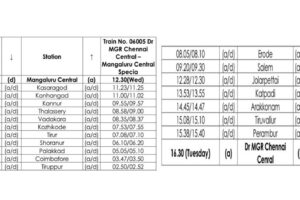 മംഗളൂരു സെന്ട്രലില്നിന്ന് ചെന്നൈ സെന്ട്രലിലേക്കും തിരിച്ചും പ്രത്യേക തീവണ്ടികള് സര്വീസ് നടത്തും.റിസര്വേഷന് ആരംഭിച്ചു.മംഗളൂരു സെന്ട്രല് സ്റ്റേഷനില്നിന്ന് 29-ന് രാത്രി 11-ന് പുറപ്പെടുന്ന പ്രത്യേക വണ്ടി(06006) പിറ്റേന്ന് വൈകിട്ട് 4.30-ന് ചെന്നൈ സെന്ട്രലിലെത്തും. 30-ന് ചെന്നൈ സെന്ട്രലില്നിന്ന് രാത്രി ഏഴിന് പുറപ്പെടുന്ന പ്രത്യേക... Read more »