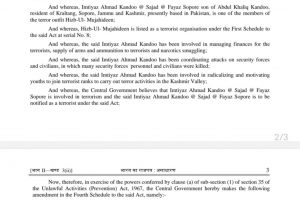 konnivartha.com : Centre designates Hizb-ul-Mujahideen member Imtiyaz Ahmad Kandoo as terrorist under UAPA konnivartha.com : ഹിസ്ബുൽ മുജാഹിദീൻ അംഗം ഇംതിയാസ് അഹമ്മദ് കണ്ടൂവിനെ തീവ്രവാദിയായി കേന്ദ്ര സര്ക്കാര് പ്രഖ്യാപിച്ചു . കശ്മീർ താഴ്വരയിൽ തീവ്രവാദ പ്രവർത്തനങ്ങൾ നടത്താൻ യുവാക്കളെ പ്രചോദിപ്പിച്ചു എന്നാണ് ആരോപണം. യുഎപിഎ പ്രകാരം ആഭ്യന്തര മന്ത്രാലയമാണ് കണ്ടൂവിനെ വ്യക്തിഗത ഭീകരനായി പ്രഖ്യാപിച്ചത്.ജമ്മു കശ്മീരിലെ സോപോറിലെ ക്രാൾട്ടാങ്ങിൽ നിന്നുള്ള കണ്ടൂ, നിലവിൽ പാകിസ്താനിലാണുള്ളതെന്ന് ആഭ്യന്തര മന്ത്രാലയം അറിയിച്ചു. ഭീകരർക്കുള്ള സാമ്പത്തികം കൈകാര്യം ചെയ്യൽ, തീവ്രവാദികൾക്ക് ആയുധങ്ങളും വെടിക്കോപ്പുകളും എത്തിക്കൽ, മയക്കുമരുന്ന് കള്ളക്കടത്ത് തുടങ്ങിയവയിലും പങ്കാളിയായതായി ആരോപിക്കപ്പെടുന്നു.1967 ലെ നിയമവിരുദ്ധ പ്രവർത്തനങ്ങൾ (പ്രിവൻഷൻ) ആക്ടിലെ സെക്ഷൻ 35-ലെ ഉപവകുപ്പ് (1)-ലെ ക്ലോസ് (എ) പ്രകാരമുള്ള അധികാരങ്ങൾ ഉപയോഗിച്ചാണ് കേന്ദ്ര സർക്കാർ നടപടി സ്വീകരിച്ചത്.