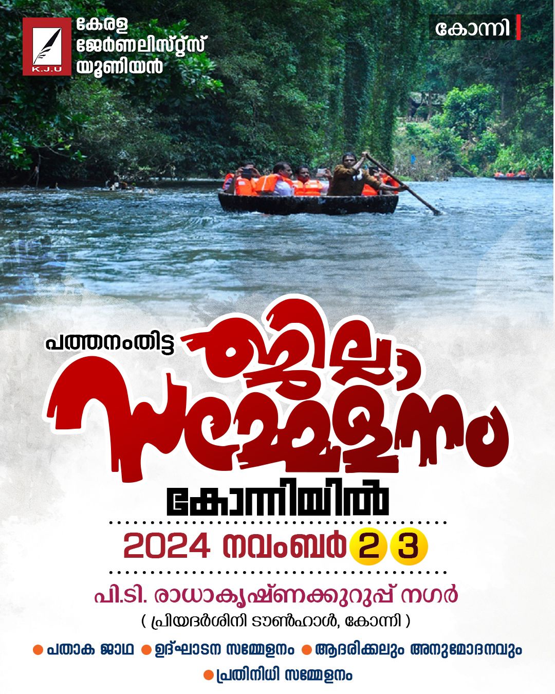 konnivartha.com: കേരള ജേർണലിസ്റ്റ് യൂണിയൻ പത്തനംതിട്ട ജില്ലാ സമ്മേളനം നവംബർ 3 ഞായറാഴ്ച കോന്നി പ്രിയദർശിനി ടൗൺ ഹാളിൽ ( പി.ടി. രാധാകൃഷ്ണക്കുറുപ്പ് നഗർ) നടക്കും. സമ്മേളത്തിന് മുന്നോടിയായി നവംബർ 2 ന് പതാക ജാഥ സംഘടിപ്പിക്കും. കെ.ജെ.യു മുൻ ജില്ലാ സെക്രട്ടറി അടൂർ മേലൂട് പി.ടി രാധാകൃഷ്ണക്കുറുപ്പിന്റെ സ്മൃതി മണ്ഡപത്തിൽ നിന്നും രാവിലെ 9 ന് ആരംഭിക്കുന്ന പതാക ജാഥ കെ.ജെ.യു സംസ്ഥാന വൈസ് പ്രസിഡൻ്റ് സനിൽ അടൂർ ഉദ്ഘാടനം ചെയ്യും. ജില്ലാ പ്രസിഡൻ്റ് രാജു കടക്കരപ്പള്ളി ജാഥാ ക്യാപ്റ്റനും ജില്ലാ ട്രഷറർ ഷാജി തോമസ് ജില്ലാ വൈസ് പ്രസിഡൻ്റ് ജിജു വൈക്കത്തുശ്ശേരി എന്നിവർ വൈസ് ക്യാപ്റ്റൻമാരും ജില്ലാ വൈസ് പ്രസിഡൻ്റ് ആർ വിഷ്ണുരാജ് ജാഥാ മാനേജരും ആയ പതാക ജാഥ അടൂർ, പന്തളം, തിരുവല്ല, മല്ലപ്പള്ളി, കോഴഞ്ചേരി, റാന്നി, പത്തനംതിട്ട, കോന്നി എന്നീ…