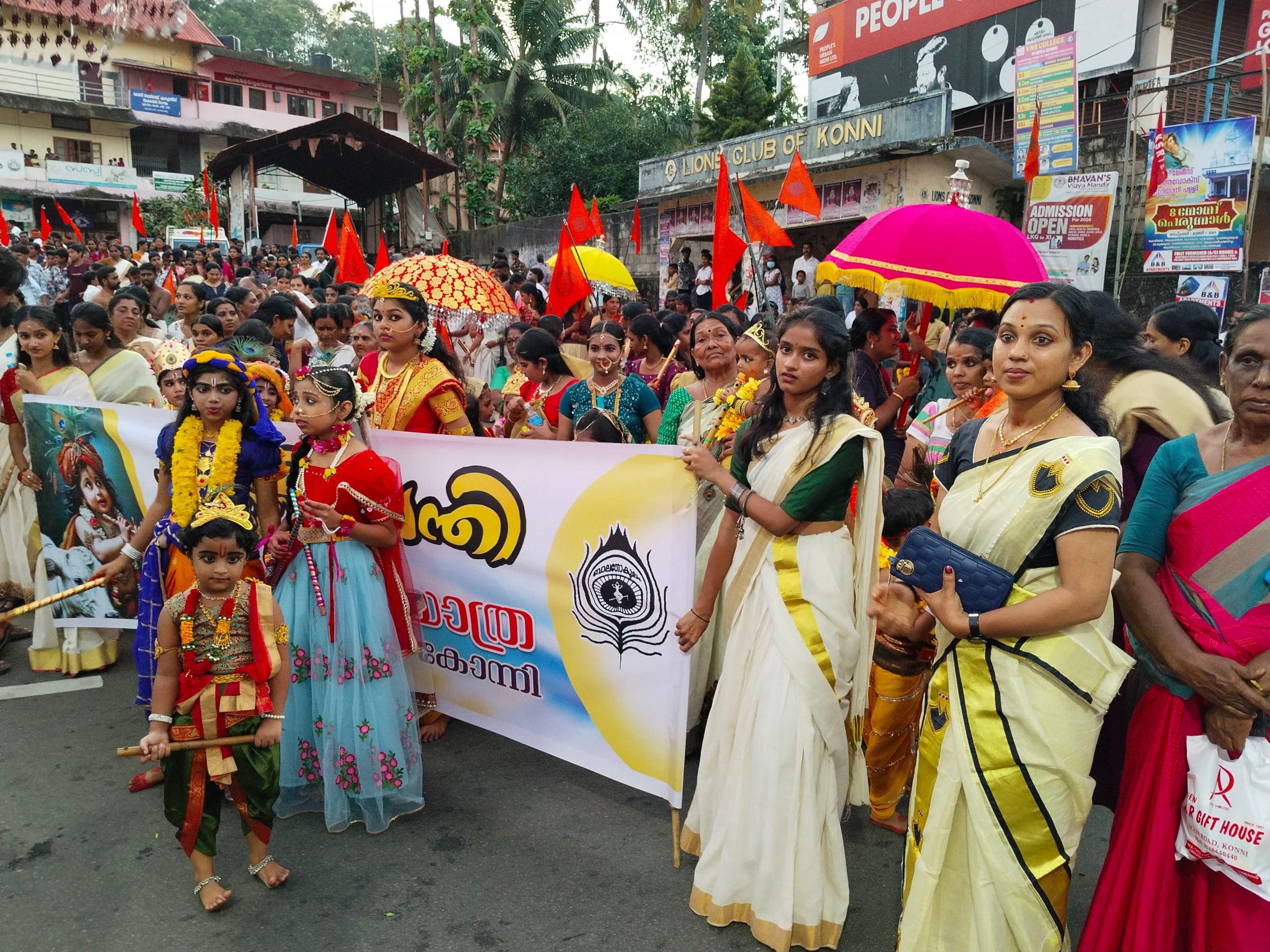 konnivartha.com: ശ്രീകൃഷ്ണജയന്തിയോടനുബന്ധിച്ച് ബാലഗോകുലത്തിന്റെ ആഭിമുഖ്യത്തിൽ നാടെങ്ങും ശോഭായാത്രകൾ നടന്നു.ശ്രീകൃഷ്ണഭഗവാന്റെ ജന്മാഷ്ടമി നാളിൽ നഗരവീഥികൾ കീഴടക്കി അമ്പാടിക്കണ്ണൻമാരും രാധമാരും.ചിരിതൂകി കളിയാടി നടന്നുനീങ്ങുന്ന ഉണ്ണികണ്ണൻമാരെയും രാധമാരെയും കാണാനായി അനേകായിരങ്ങള് ആണ് ഒഴുകിയെത്തിയത് ഉണ്ണികണ്ണന്മാരും രാധമാരും അണിനിരന്ന നിശ്ചല ദൃശ്യങ്ങളോടെയുള്ള വിപുലമായ ശോഭയാത്രകൾക്ക് പുറമെ സാംസ്കാരിക സംഗമങ്ങള്, ഗോപൂജ, ഉറിയടി,പ്രഭാതഭേരി, ഗോപികാനൃത്തം തുടങ്ങി വിവിധപരിപാടികള് നടന്നു. കോന്നിയിലെ വിവിധ സ്ഥലങ്ങളില് നിന്നും വന്ന ശോഭായാത്രകള് കോന്നി മഠത്തില് കാവില് സംഘമിച്ചു മഹാ ശോഭായാത്രയായി കോന്നി നഗരം ചുറ്റി കോന്നി മങ്ങാരം ഇളങ്ങവട്ടം ശ്രീ കൃഷ്ണ സ്വാമി ക്ഷേത്രത്തില് സമാപിച്ചു . ഇവിടെ ഉറിയടിയും അവില് പ്രസാദവും നടന്നു .